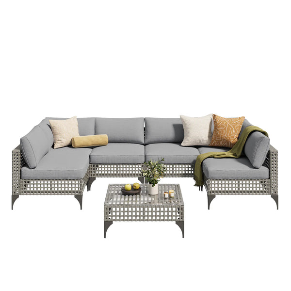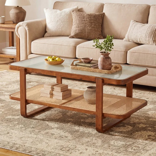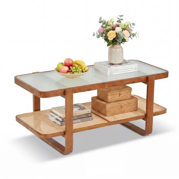 Rattan Coffee Table with Tempered Glass Top & Storage Shelf