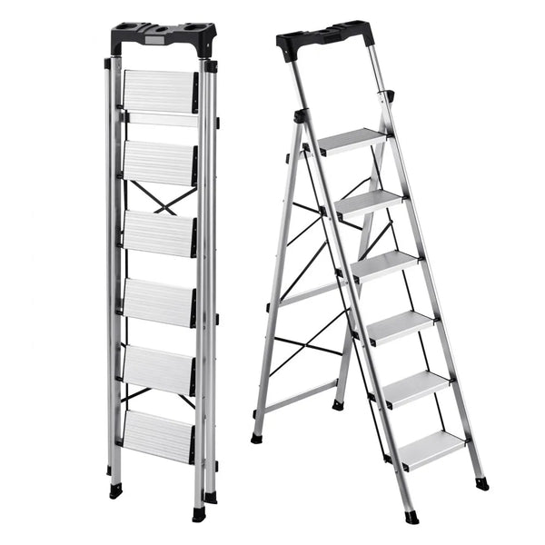 6-Step Folding Ladder – 330 lb Capacity Aluminum Step Ladder with Tool Tray & Anti-Slip Pedals – Silver