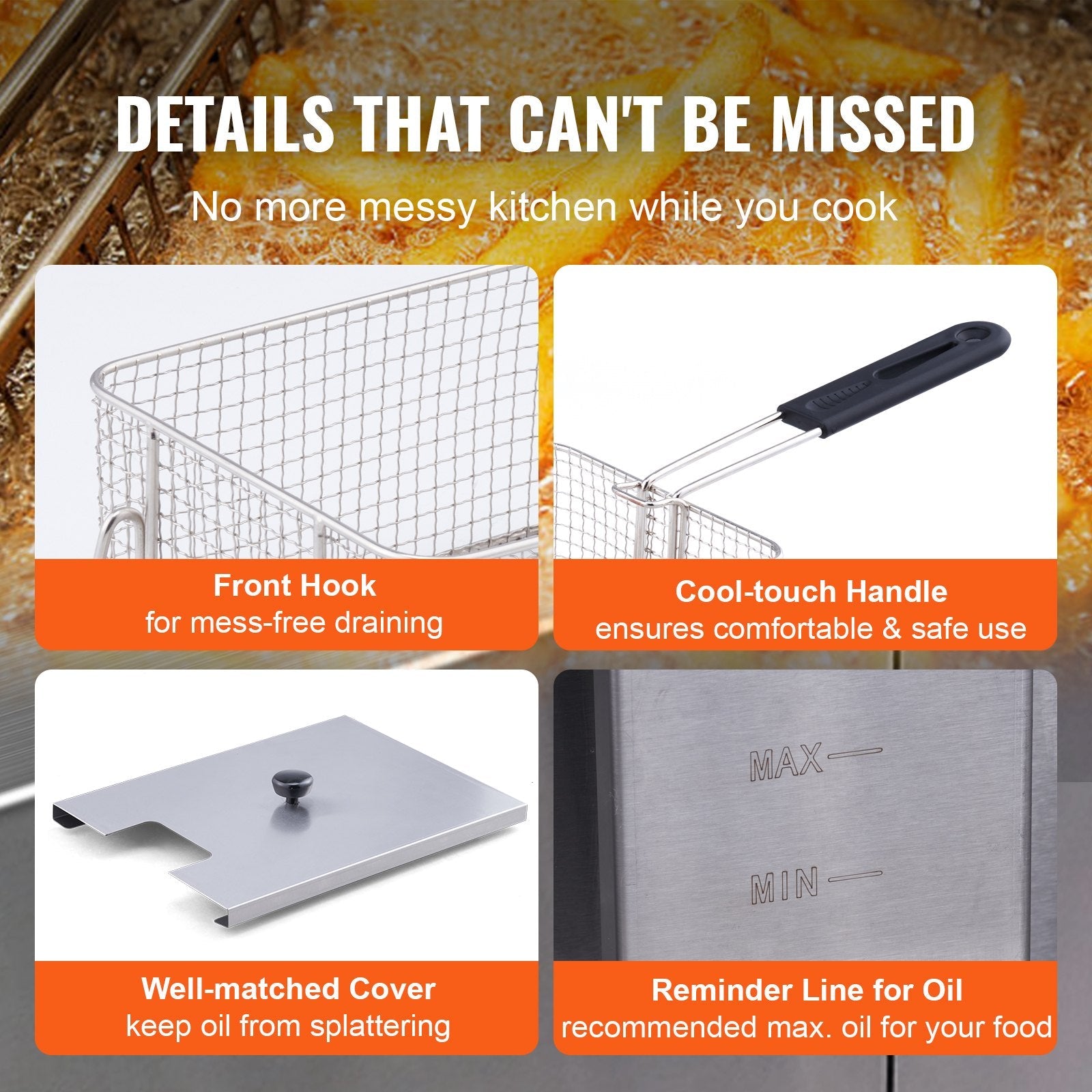 Designed for high-efficiency frying, the VEVOR Commercial Electric Deep Fryer offers a large 24L oil capacity and dual 1500W heating elements, ideal for restaurants, food trucks, and catering setups. With precise temperature and timer controls, removable baskets, and a stainless steel build, this fryer delivers reliable performance and easy maintenance. Whether you're frying chicken, fish, or snacks, this unit is built for speed, consistency, and commercial durability.