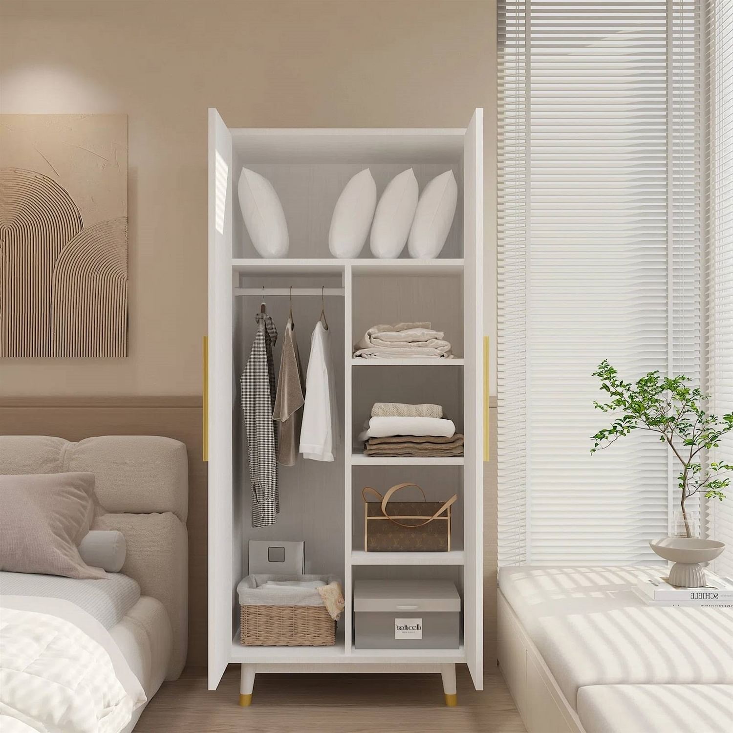 Compact and Practical Design: The 2-door layout maximizes space efficiency, offering a smart and practical solution for organizing your garments. The included hanging rod allows you to neatly hang shirts, dresses, and other clothing items, preventing wrinkles and ensuring easy access.