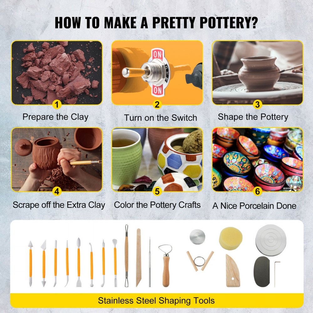 The VEVOR Mini Pottery Wheel is a compact and powerful tool designed for pottery enthusiasts, artists, and DIY crafters. Equipped with a 30W motor and an adjustable speed range from 0 to 2000 RPM, this electric pottery wheel delivers smooth and precise rotation for sculpting, molding, and shaping clay. It comes complete with three interchangeable turntables and 16 essential sculpting tools, making it perfect for creating ceramic art at home or in the studio. Whether you're a beginner or a skilled artist, this mini pottery wheel offers portability, performance, and creative freedom.