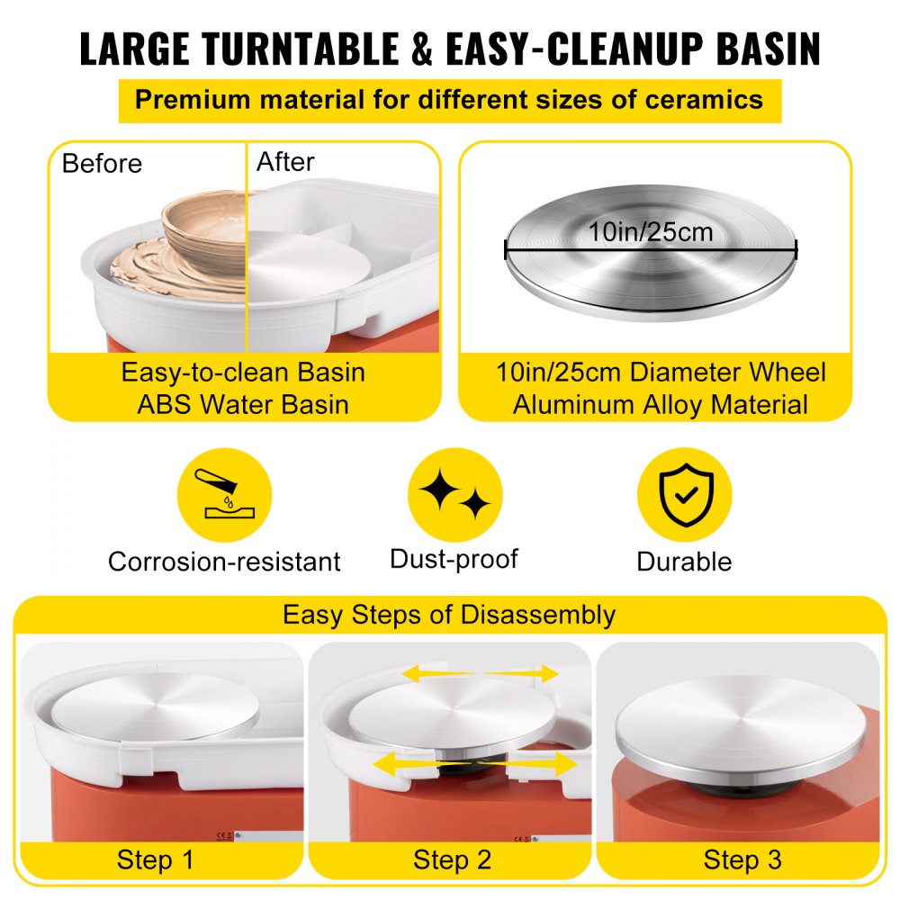 10" Turntable: 25 cm aluminum alloy wheel for even, stable clay forming.