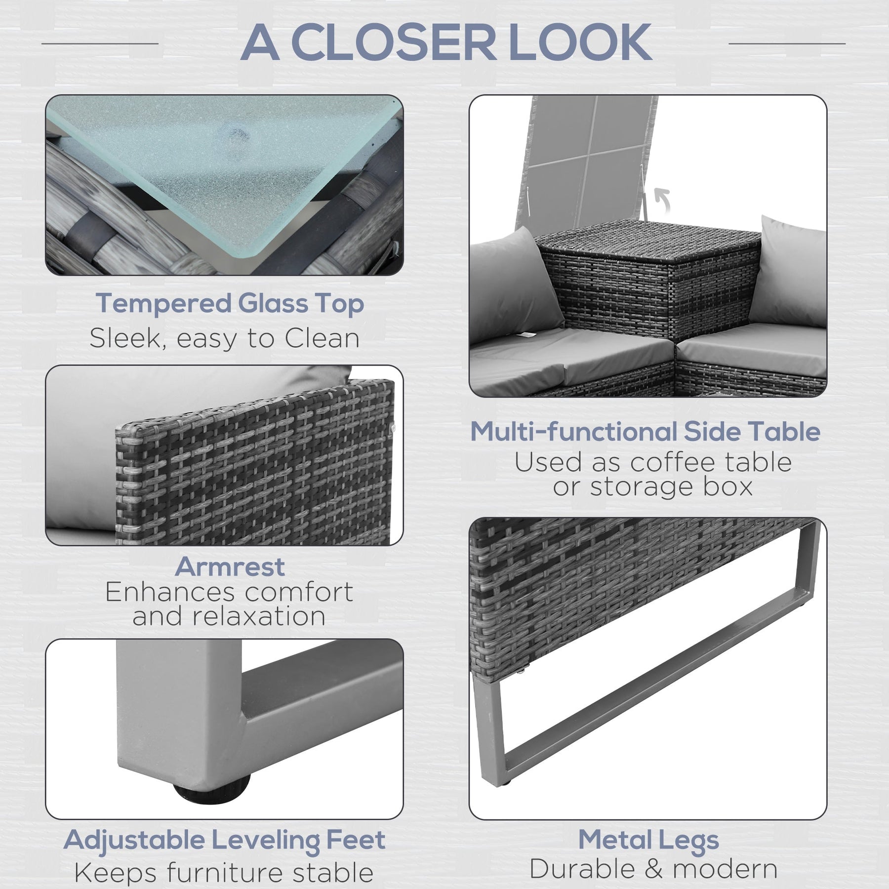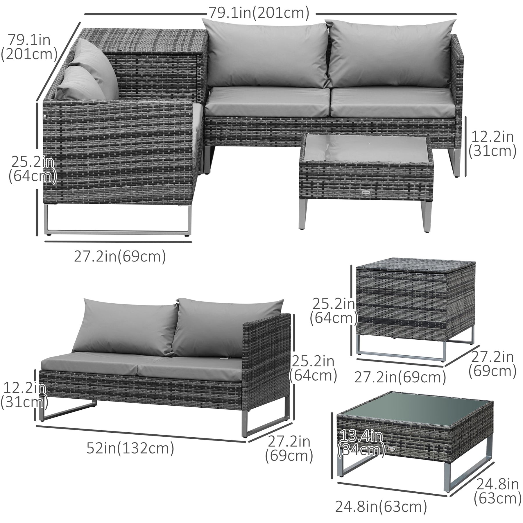 Upgrade your outdoor space with this versatile and stylish 4-piece rattan corner sofa set, designed for comfort, function, and elegance. Perfect for patios, gardens, balconies, or poolside areas, this outdoor sectional includes two spacious two-seater sofas, a tall square storage table that fits neatly between the sofas, and a sleek coffee table—offering ample seating for up to four people. The sturdy powder-coated metal frame is wrapped in durable, weather-resistant PE rattan for long-lasting performance against UV rays and light water exposure. Thick, soft grey cushions with machine-washable covers ensure ultimate relaxation, making it perfect for all-day lounging. The tall central table doubles as a hidden storage trunk to keep your outdoor essentials tucked away, while the tempered glass tabletop on the coffee table adds a clean, modern finish that's easy to maintain. This set strikes the ideal balance between luxury, practicality, and space-saving design, making it a standout addition to any outdoor setup.