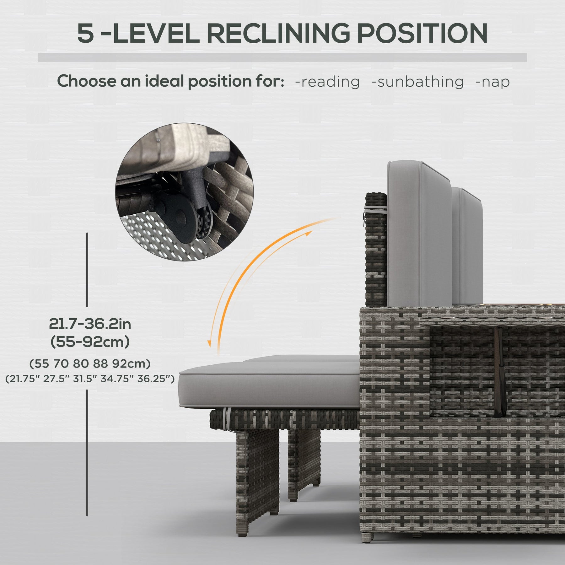 Enjoy your summer to the fullest with this stylish and practical five-piece outdoor lounge set, designed for pure relaxation. The set includes two adjustable chaise loungers, two footstools with hidden storage, and a sleek side table, making it perfect for unwinding with a friend in any garden, patio, or outdoor space. Each lounger features a 5-position adjustable backrest, including a flat position for sunbathing, and comes with thick, comfortable cushions that are secured with straps and have removable, washable covers for easy maintenance. The hidden storage in the footstools offers a smart solution for keeping essentials like books, towels, or throws close at hand yet out of sight. Built with a strong powder-coated steel frame and wrapped in durable, weather-resistant PE wicker, this set is made to last. The included side table features a tempered glass top for added sophistication and effortless cleaning. Anti-slip footpads complete the design, helping protect your floors while providing stability. Whether you're lounging by the pool or soaking in the sun on your deck, this lounger set brings comfort, function, and modern flair to your outdoor living area.