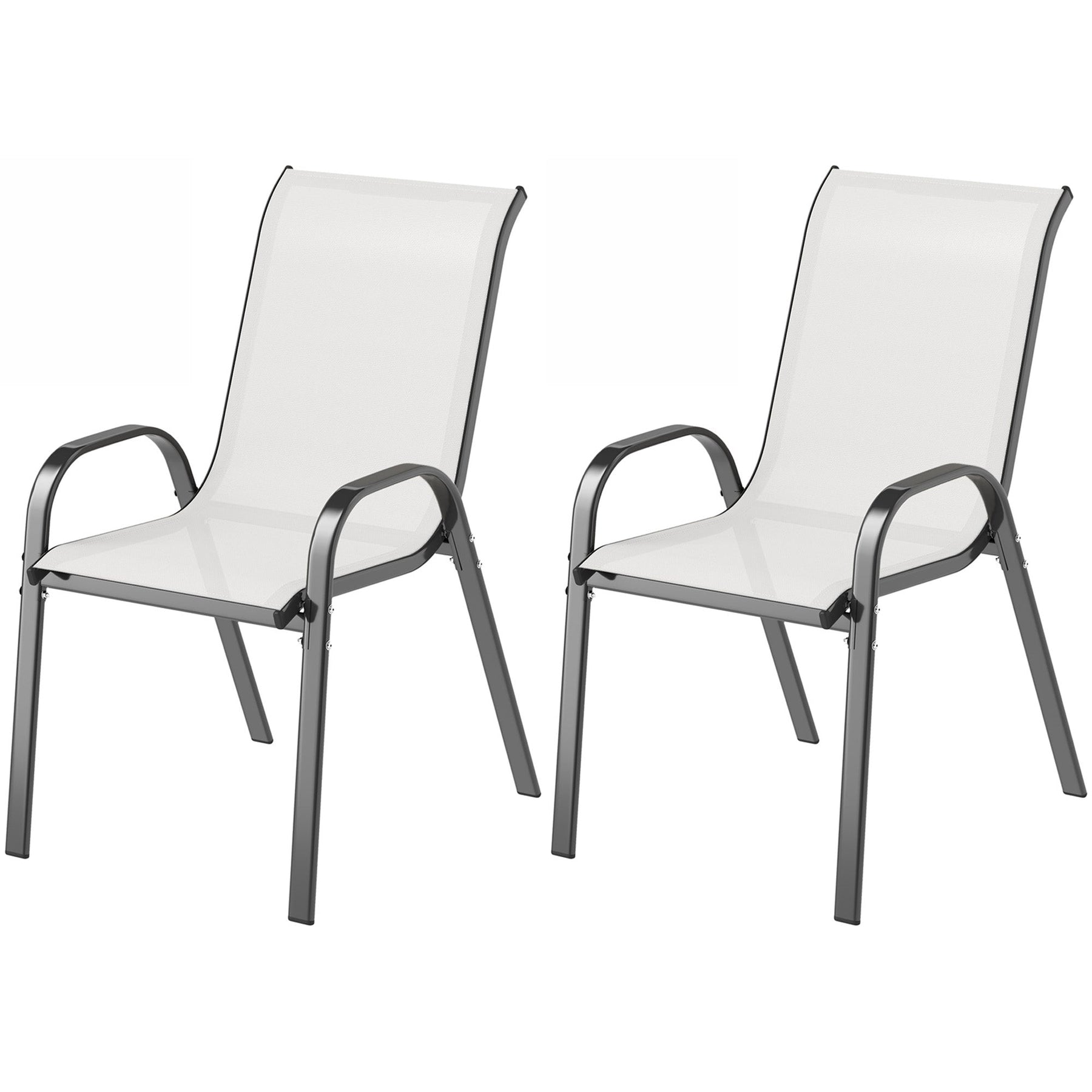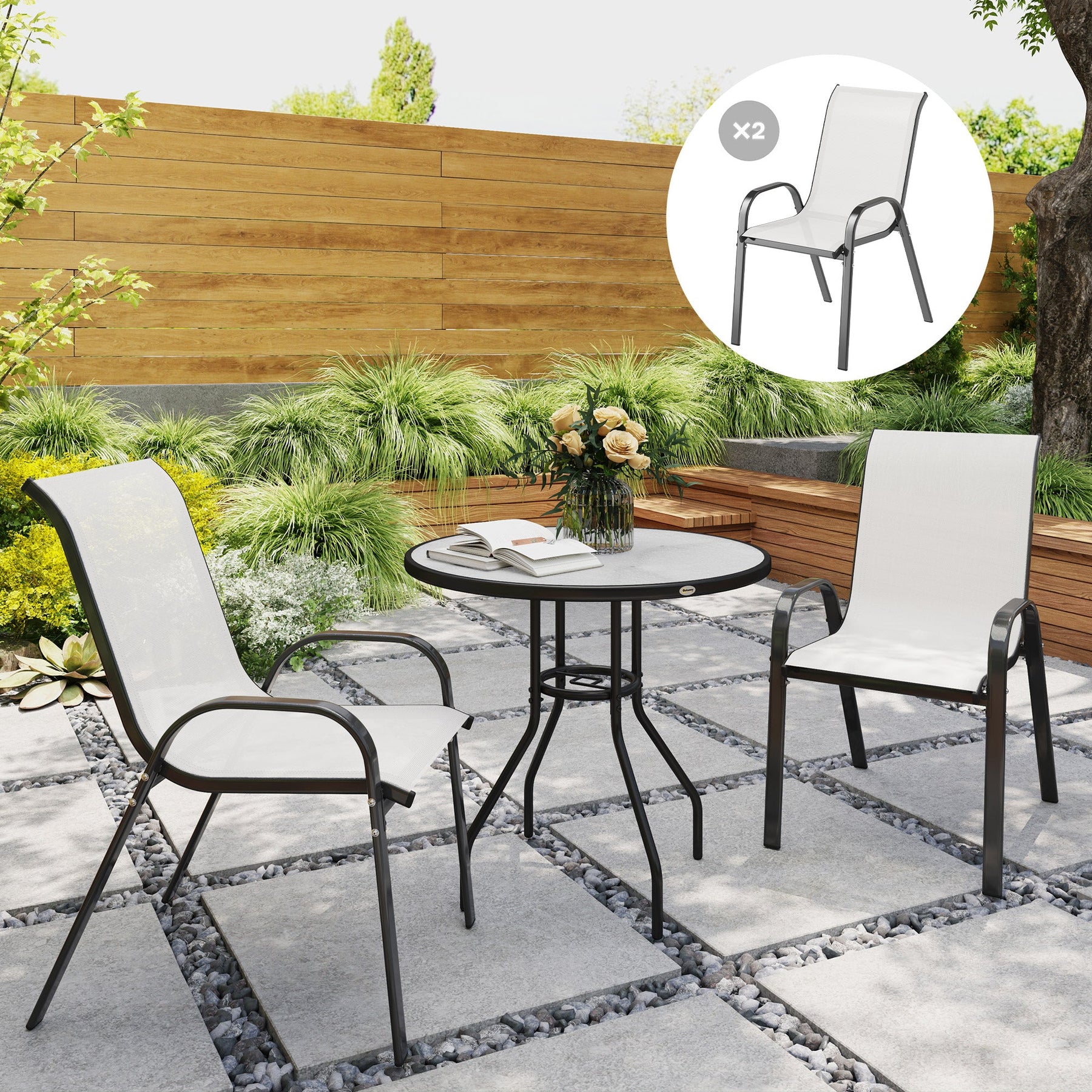 Enjoy comfort and style with this set of two outdoor dining chairs. Perfect for meals, drinks, or simply relaxing in the fresh air, these chairs transform your patio or deck into a cozy retreat. Designed with stackable convenience, these chairs can be easily stored away when not in use, making them ideal for smaller outdoor spaces. The breathable mesh seat is quick-drying, tear-resistant, and keeps you cool even on hot days. With curved armrests and a sloping high back, these chairs offer ultimate comfort. Built with a strong steel frame and powder coating for added weather resistance, they are durable and ready for the elements. Non-slip foot pads help protect your surfaces from damage.
