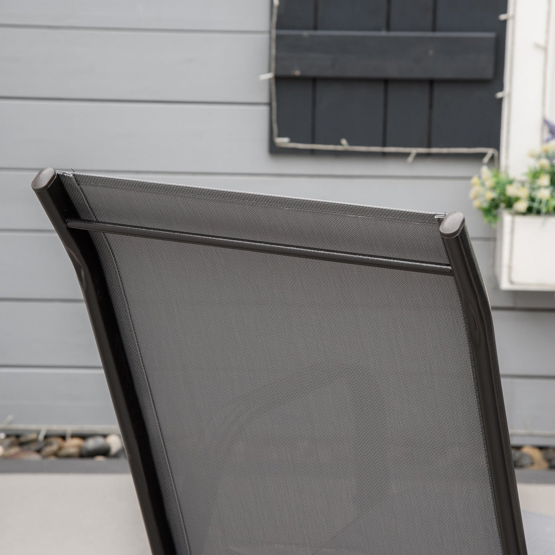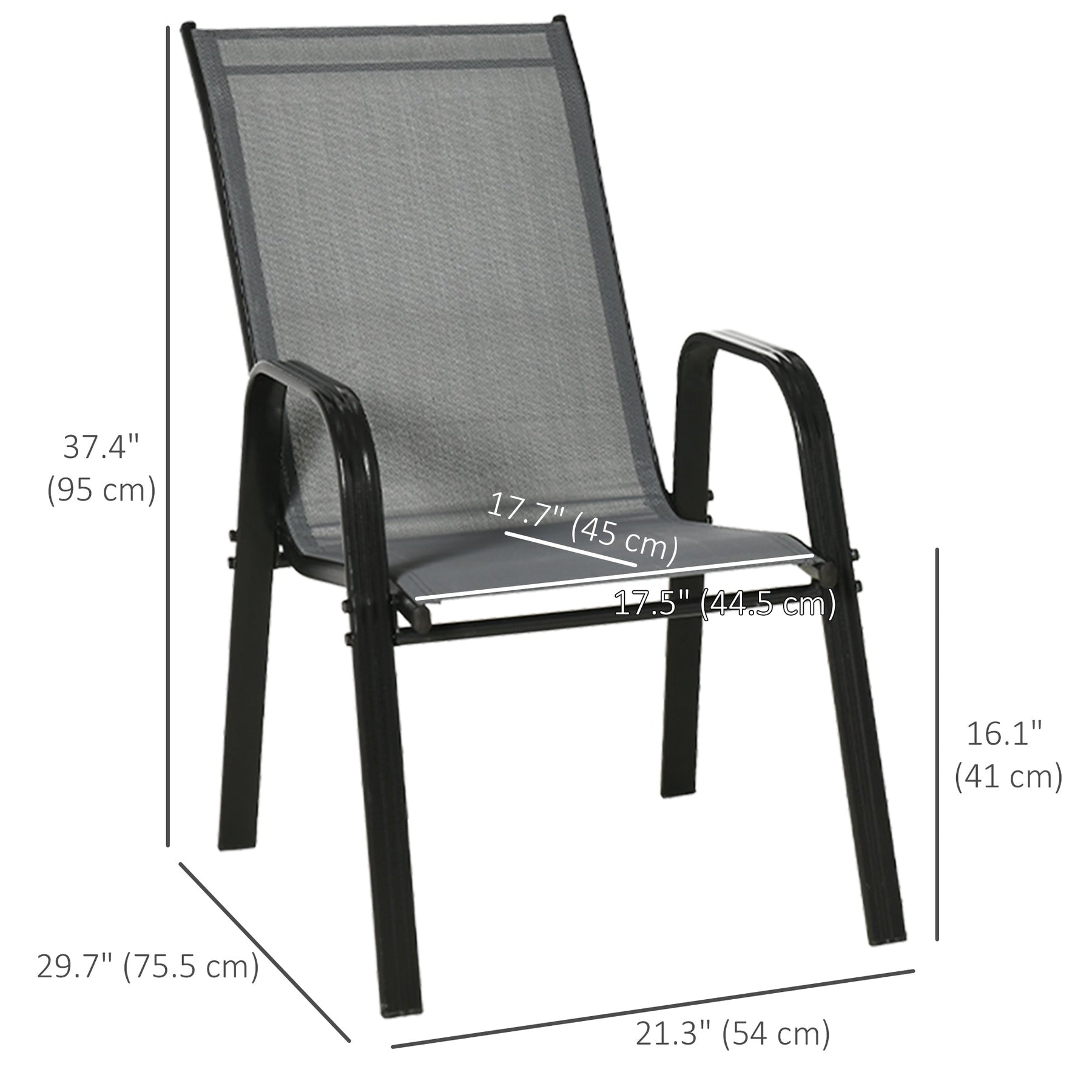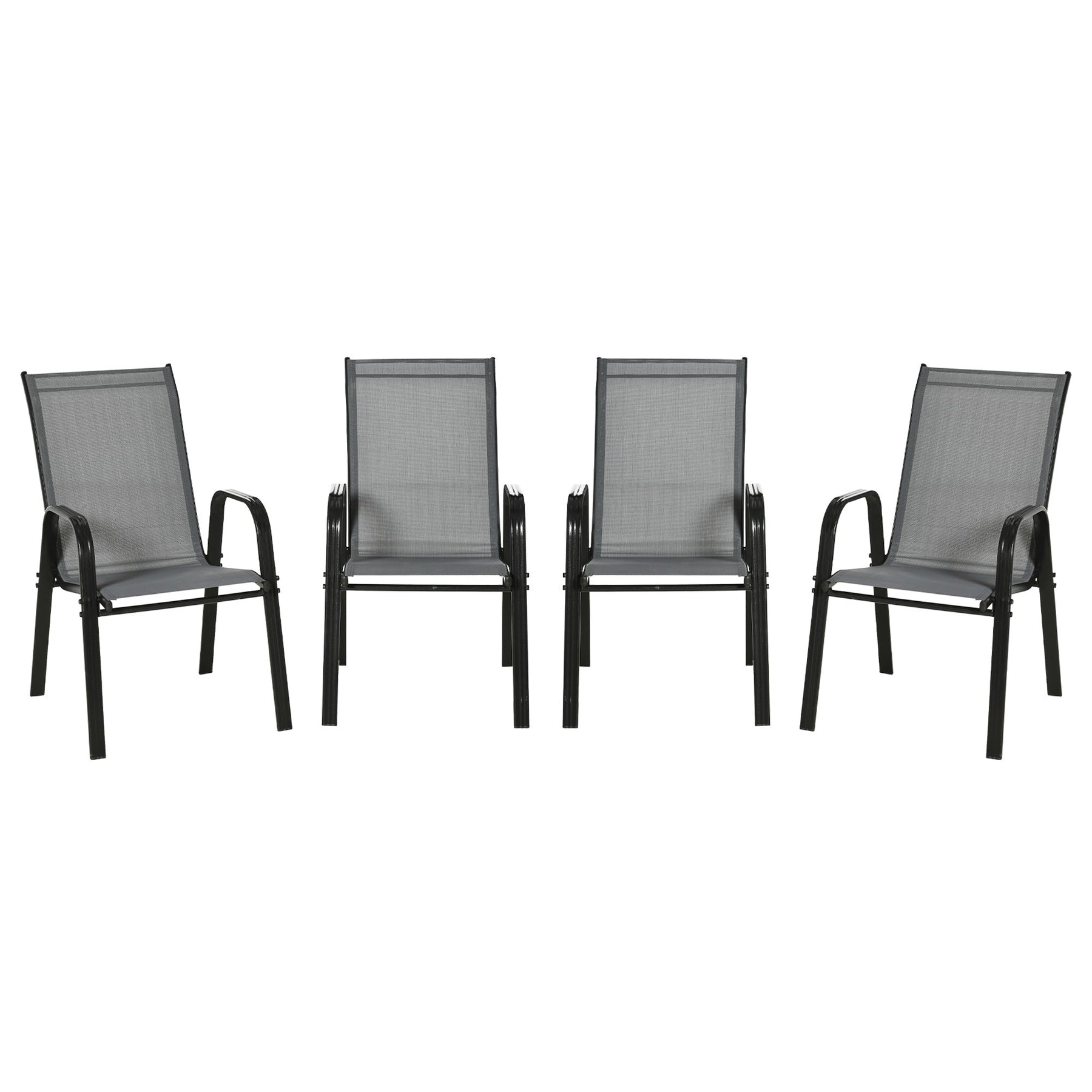 This portable lawn set includes four metal patio chairs, perfect for enjoying conversations with friends and family, whether indoors or outdoors. Each chair is covered with breathable texteline fabric on the seat and backrest, allowing air circulation to avoid heat and sweat build-up. The stackable design makes it easy to store the chairs when not in use, helping to save space and keep your garden tidy. Constructed with a durable steel frame featuring black powder coating, these chairs are resistant to peeling and corrosion, making them ideal for outdoor use.
