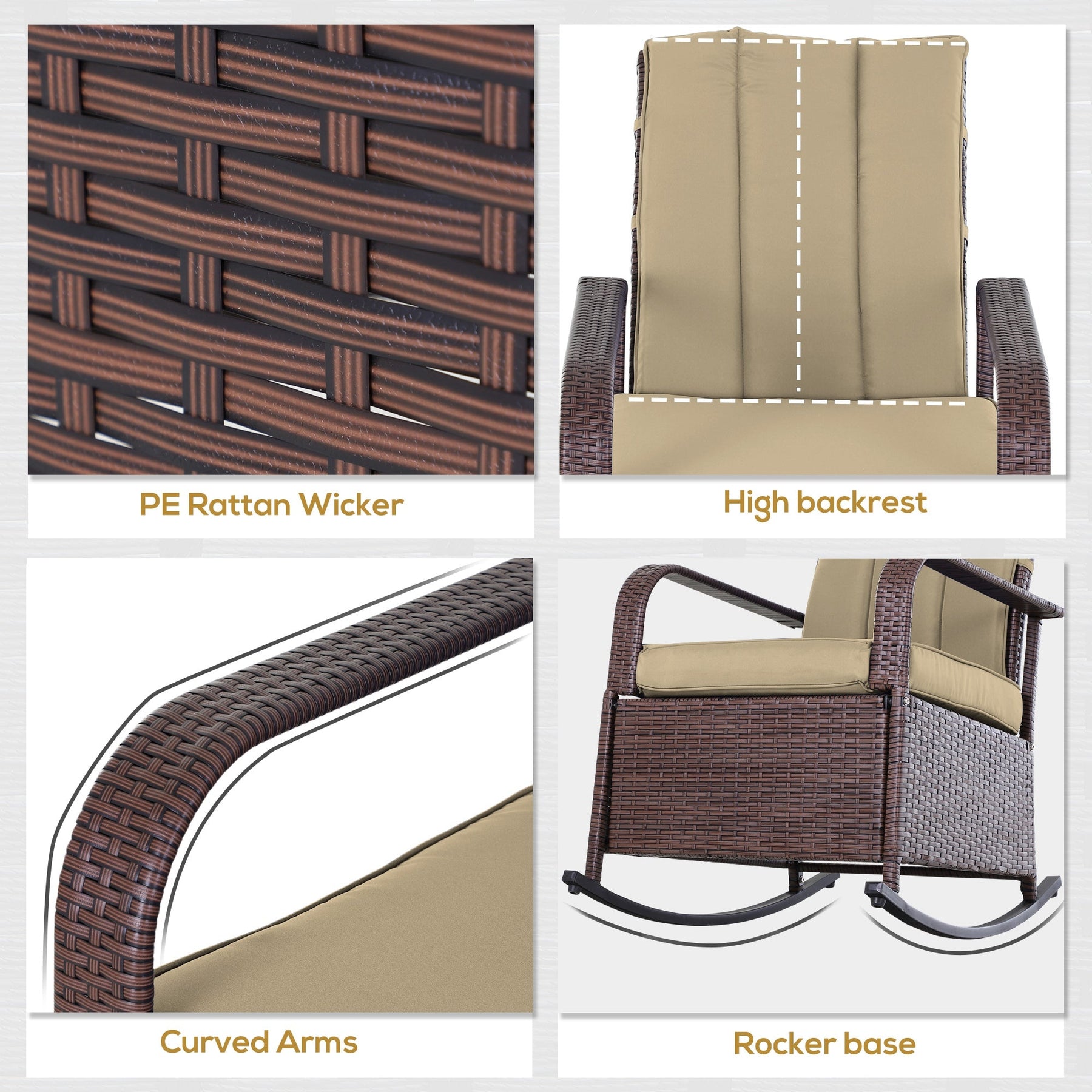 Outsunny Wicker Rocking Chair Outdoor Patio PE Rattan Recliner with Cushion Adjustable Footrest Khaki