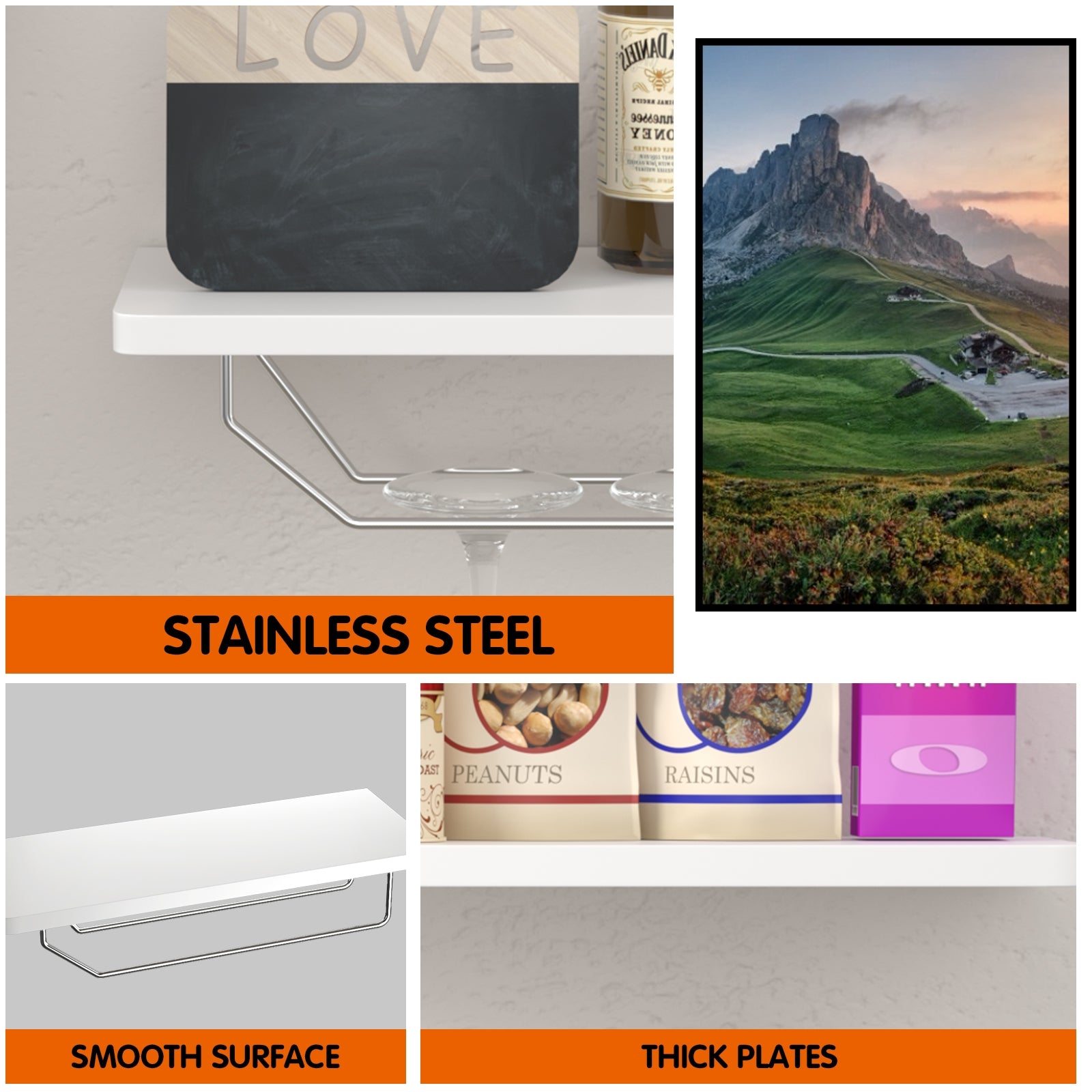 Glass racks can hold up to 3 wine glasses with ease, and a partition provides extra space for small items like knick-knacks, plants, or photos.