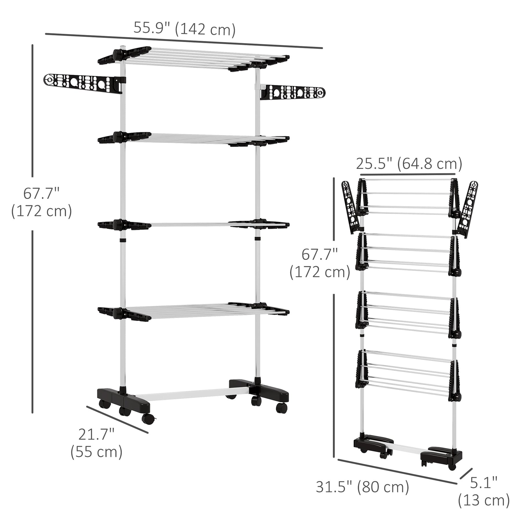 Maximize your laundry drying space with this Large Capacity Clothes Drying Rack, featuring 4 height-adjustable tiers with wave clips on both ends and 2 rotatable side wings with multiple slots for efficient air drying. This versatile rack provides ample space for socks, towels, plush toys, blankets, and more. The collapsible design allows for easy folding and compact storage when not in use, making it perfect for small spaces. Crafted from rust-proof stainless steel, this sturdy and durable drying rack is ideal for both indoor and outdoor use. It comes with 6 easy-rolling universal casters, including 2 locking wheels for stability and effortless movement around the home. Whether drying clothes, sheets, towels, linens, or tablecloths, this rack is a must-have for efficient and convenient laundry care.