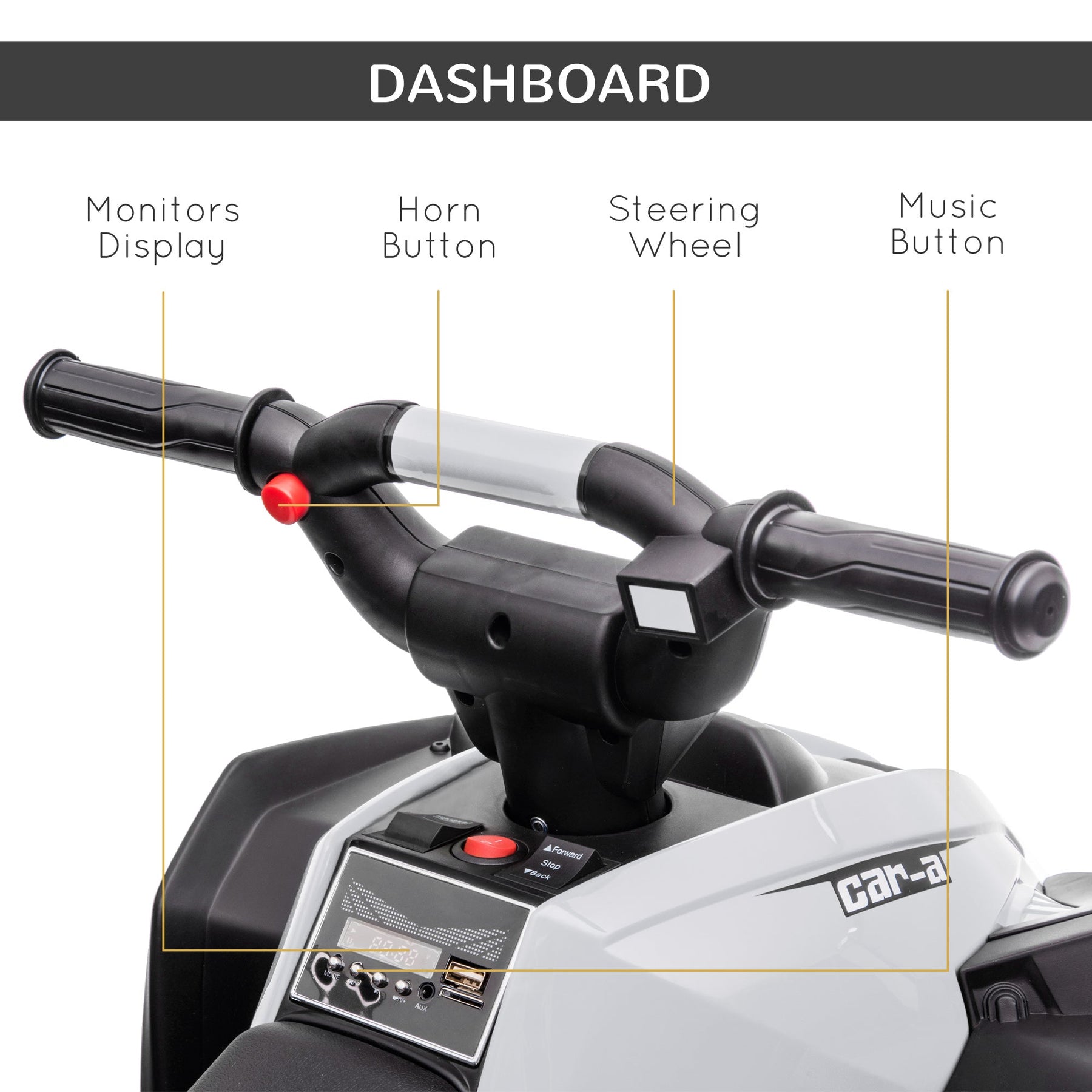 The kids' 4-wheeler also includes an AUX port, allowing your little one to enjoy their favorite music while cruising around. The start-up engine sound and USB charging port add a touch of realism, making the ride even more enjoyable. The comfortable seat and easy-to-hold handlebars make for a pleasant experience, allowing your child to enjoy their ride while staying safe and comfortable.