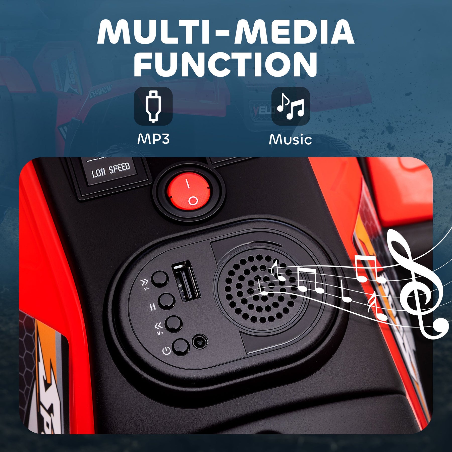 This kids' 4-wheeler is packed with power, featuring durable wear-resistant wheels and 12V twin motors for smooth and rugged riding on various surfaces like cement and asphalt. With its advanced design and more power, your little rider will have the time of their life. The MP3 port lets them enjoy their favorite music, while the USB port allows them to charge devices. The ATV also features three headlights, adding a cool touch to their adventure.