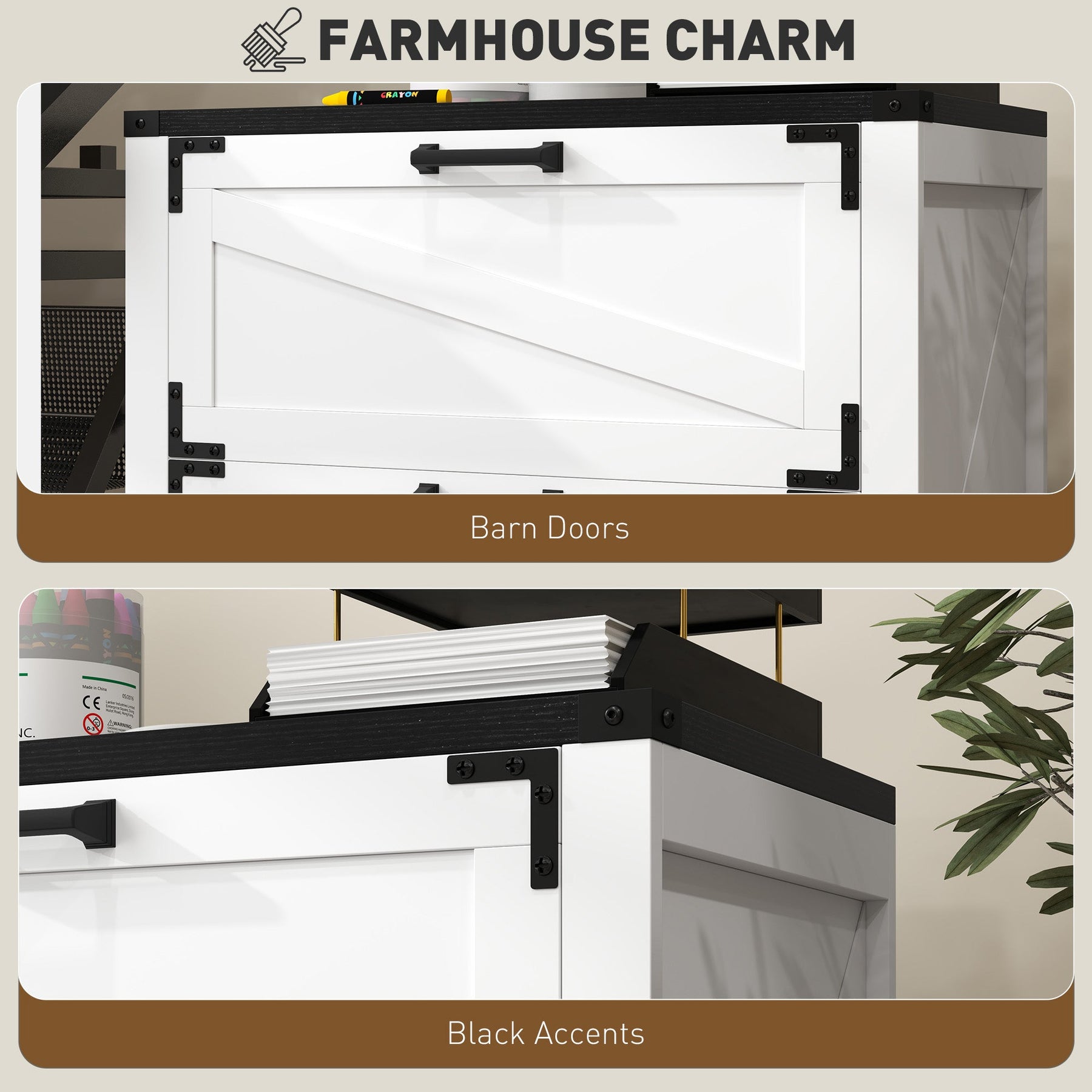 Bring farmhouse charm and modern functionality into your home office with this elegant file cabinet. Featuring barn-style panels and black accents, it adds a rustic yet contemporary touch to any workspace. With two spacious drawers equipped with adjustable hanging bars, this filing cabinet easily accommodates letter, A4, and legal-sized files to keep your documents neatly organized. The 0.98" (25mm) thick tabletop provides a sturdy surface for a printer, decor, or office essentials. Anti-tipping hardware adds stability and safety, while easy-to-follow instructions make assembly a breeze.