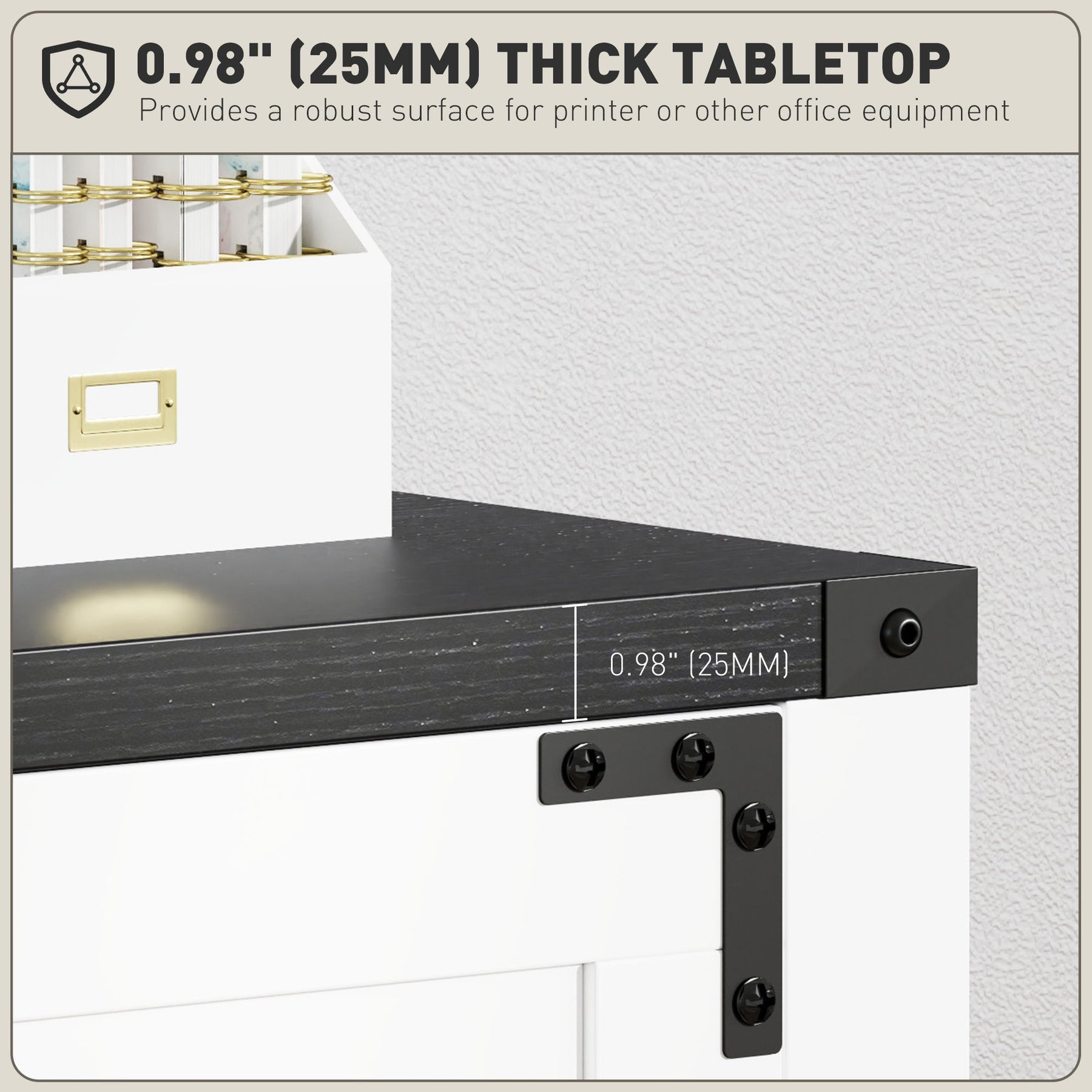• Stable and Safe: 0.98" (25mm) thick tabletop for printers or office supplies, with anti-tipping hardware for added stability.