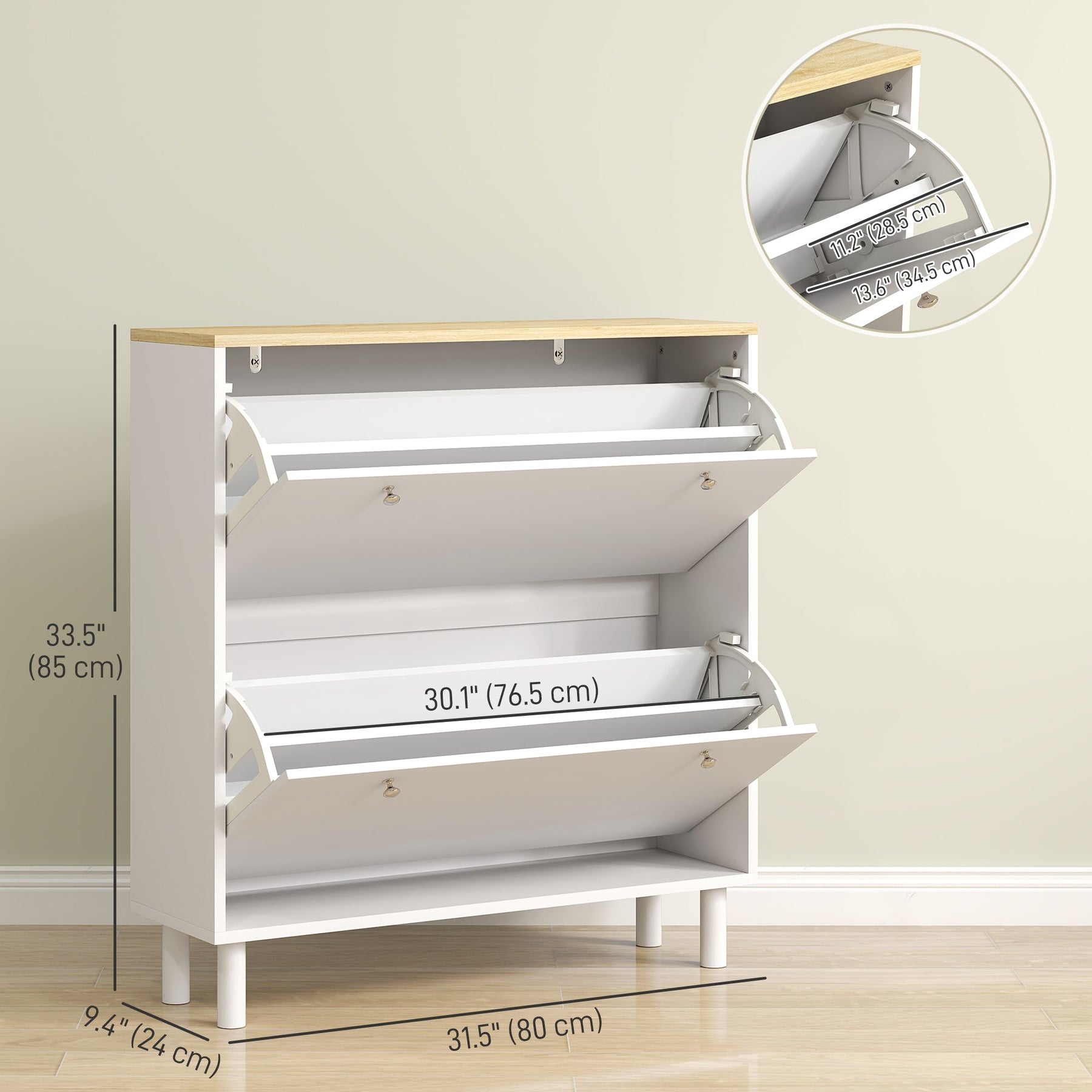 Keep your entryway neat and organized with this stylish narrow shoe cabinet. Featuring two flip drawers that can hold up to 16 pairs of shoes (size CA 10), this cabinet maximizes space while maintaining a tidy appearance. The adjustable two-level shelves offer versatile storage for shoes of various sizes. Its sleek, modern design includes a light oak wood grain top, silver round handles, and a solid color finish, making it a perfect complement to any entryway. Crafted with solid wood legs and an anti-tipping design, it ensures both stability and safety in your home. Easy assembly is required to complete this functional yet chic storage solution.