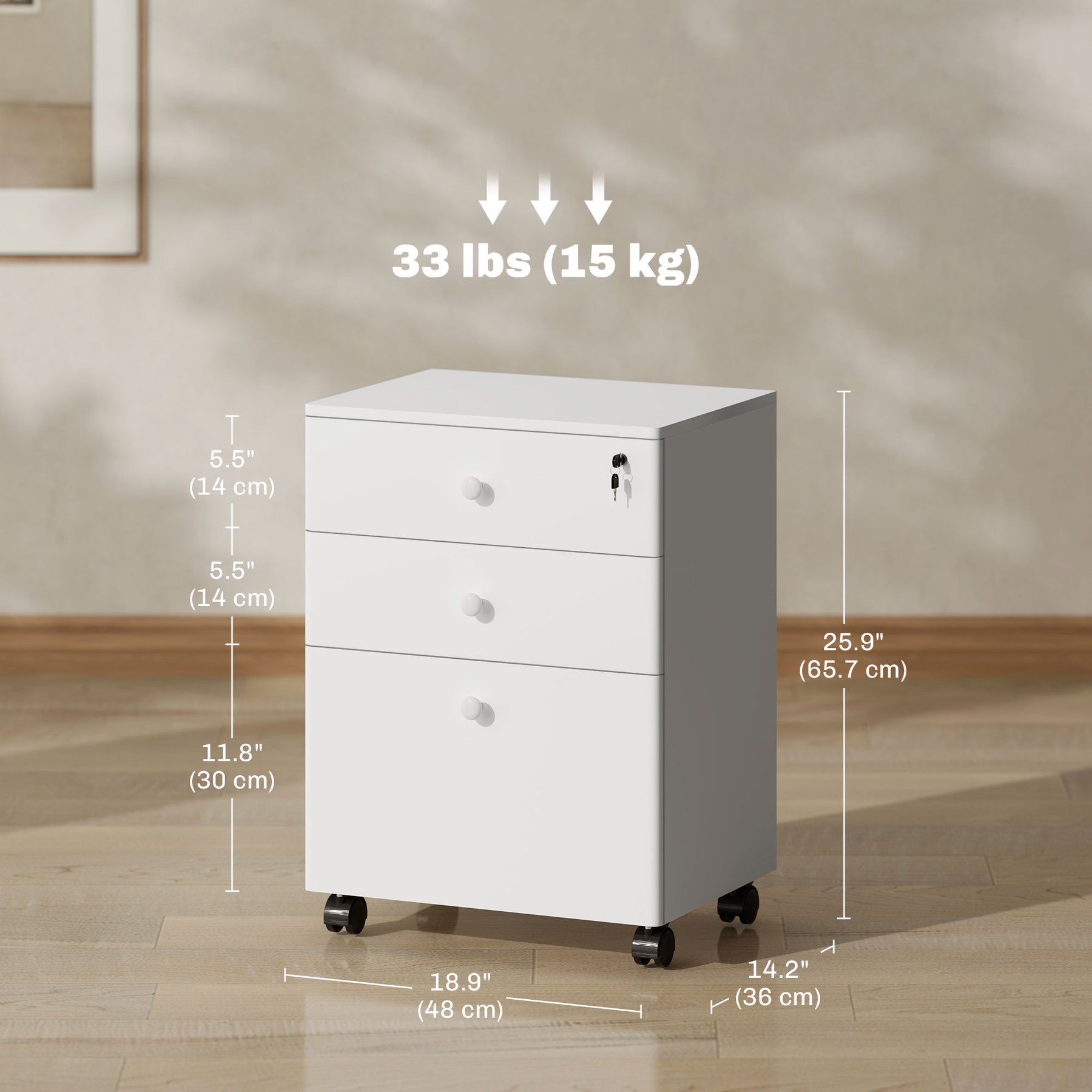 Cabinet Specifications: Overall dimensions: 18.9" W x 14.2" D x 25.9" H (48 x 36 x 65.7 cm). Supports up to 33 lbs (15 kg) overall, with each drawer holding up to 6.6 lbs (3 kg).