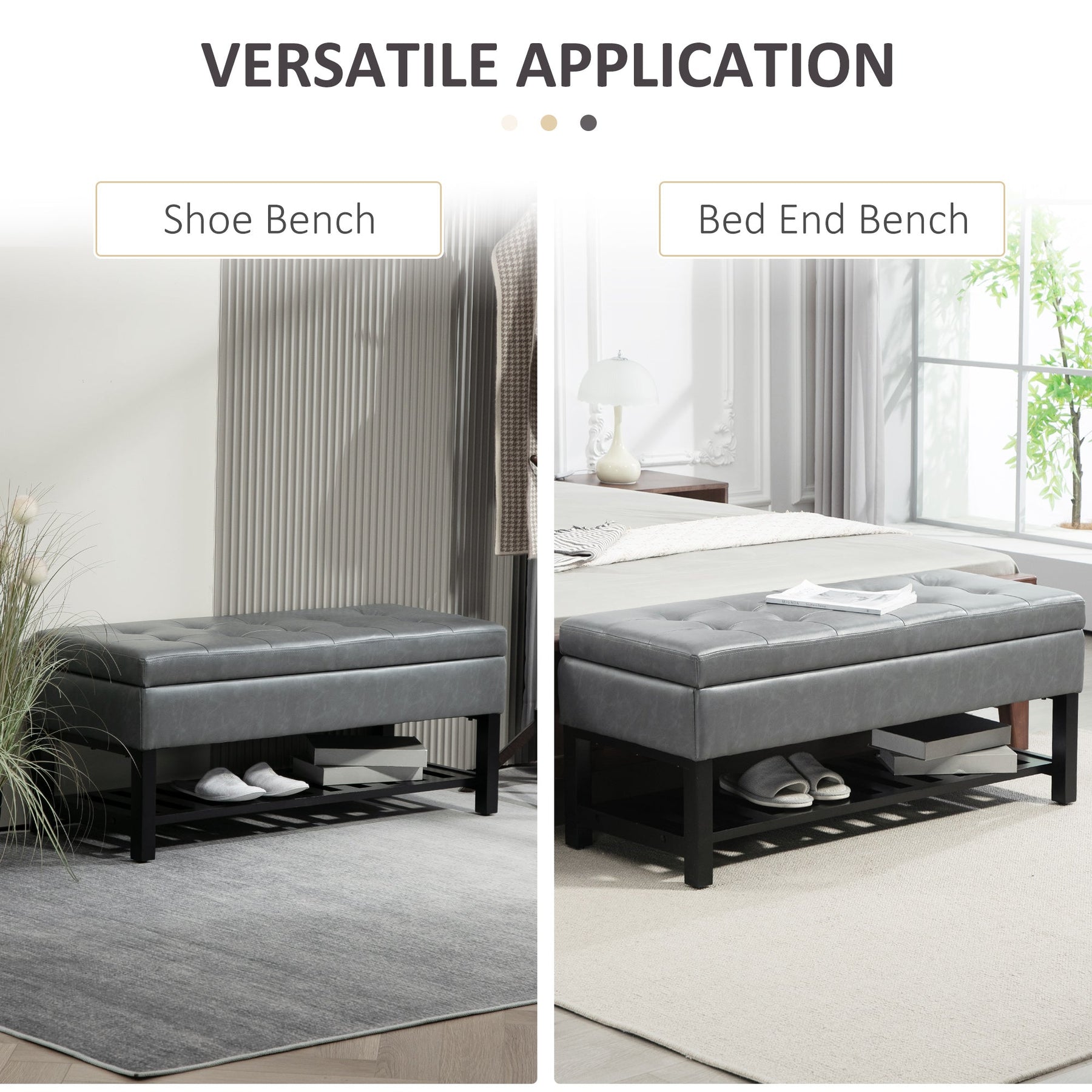 This versatile sitting bench is the perfect blend of style and functionality. Featuring a cushioned seat with a tufted design, it allows for comfortable shoe changing, and the smooth PU cover makes it easy to wipe clean. Beneath the flip-top seat, you'll find a large enclosed cabinet, providing ample storage for books, blankets, or other items. The sturdy wooden frame ensures long-lasting support, while the open lower shelf provides convenient storage for shoes, helping you stay organized and find what you need quickly. Perfect for the entryway, bedroom, or any room in need of extra storage.
