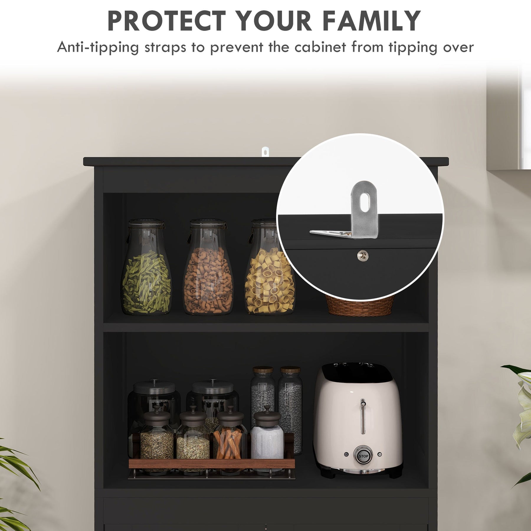 Maximize your storage space with this stylish and functional kitchen buffet with a hutch. Designed with a compact yet spacious layout, this freestanding cabinet features two-tier open shelving, a glass-paneled cabinet, and a lower double-door cabinet, providing ample room for storing dishes, canned goods, kitchen accessories, and more. The adjustable shelves allow you to customize storage for taller items like bottles, pots, or pans. Its sleek modern design, featuring beadboard door panels, silver handles, and glass accents, complements any kitchen, dining room, or even bathroom decor. For added safety, anti-tip straps are included to secure the unit to the wall, ensuring stability and preventing tipping.