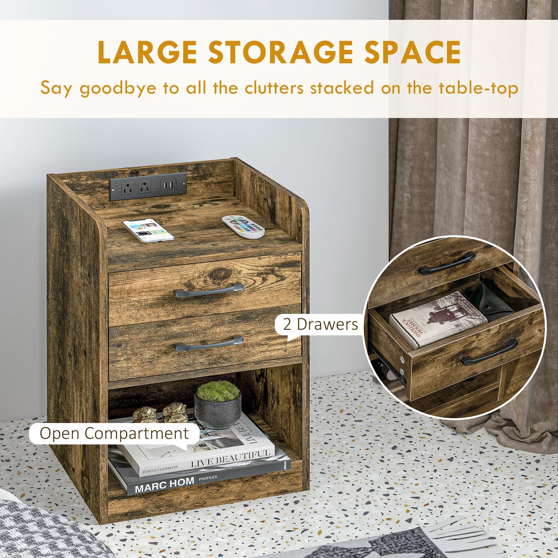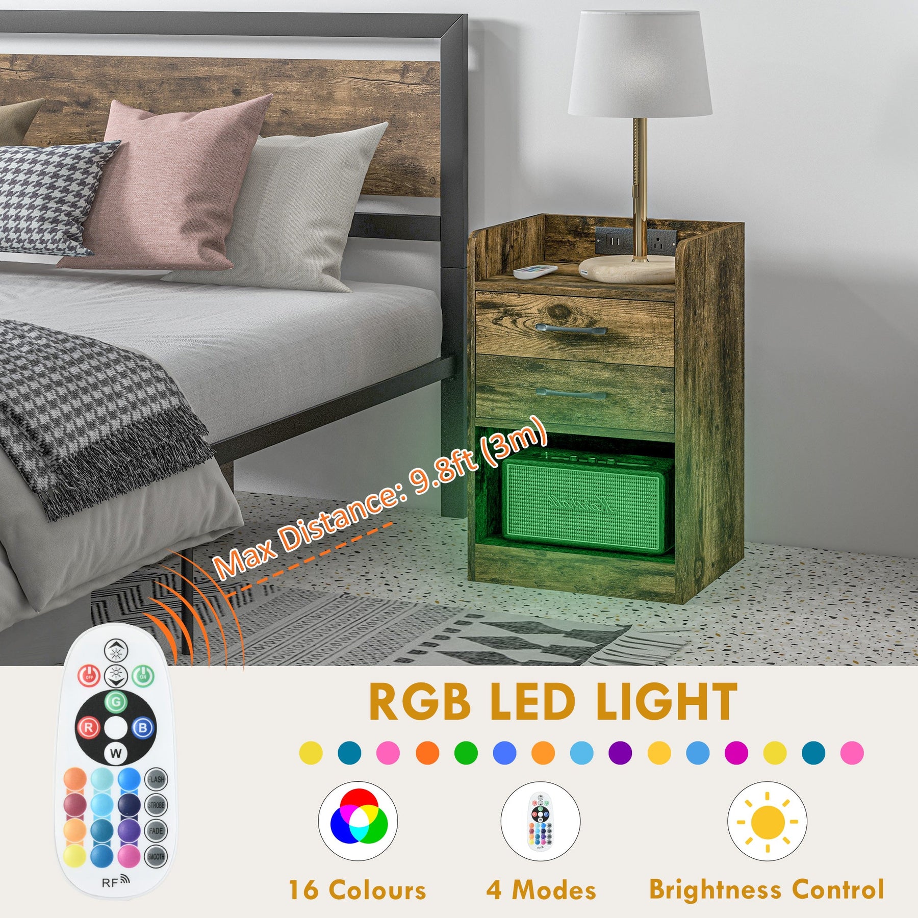 This end table with storage not only provides a stylish and practical solution for organizing your space but also adds a fun and functional lighting feature. Equipped with an LED light strip, it offers 16 color options, adjustable brightness, and four dynamic modes: flash, strobe, fade, and smooth, all controlled via remote. Perfect for setting the mood, whether you're reading, working, or relaxing. It also comes with a convenient charging station that includes 2 AC outlets and 2 USB ports, making it easy to charge your devices such as phones, tablets, lamps, and laptops. The 6.6' (2m) electrical cord gives you flexibility in placement, eliminating the need to be close to a wall outlet. For storage, this bedside table helps keep your essentials organized with a spacious open shelf and two drawers to stow away items. Whether placed beside your bed for easy access to personal items or as a side table next to your couch for a cozy evening, it is both versatile and functional. The included anti-tipping hardware ensures the table is safely secured to the wall, providing peace of mind. Easy to assemble, this end table is a practical and stylish addition to any room.