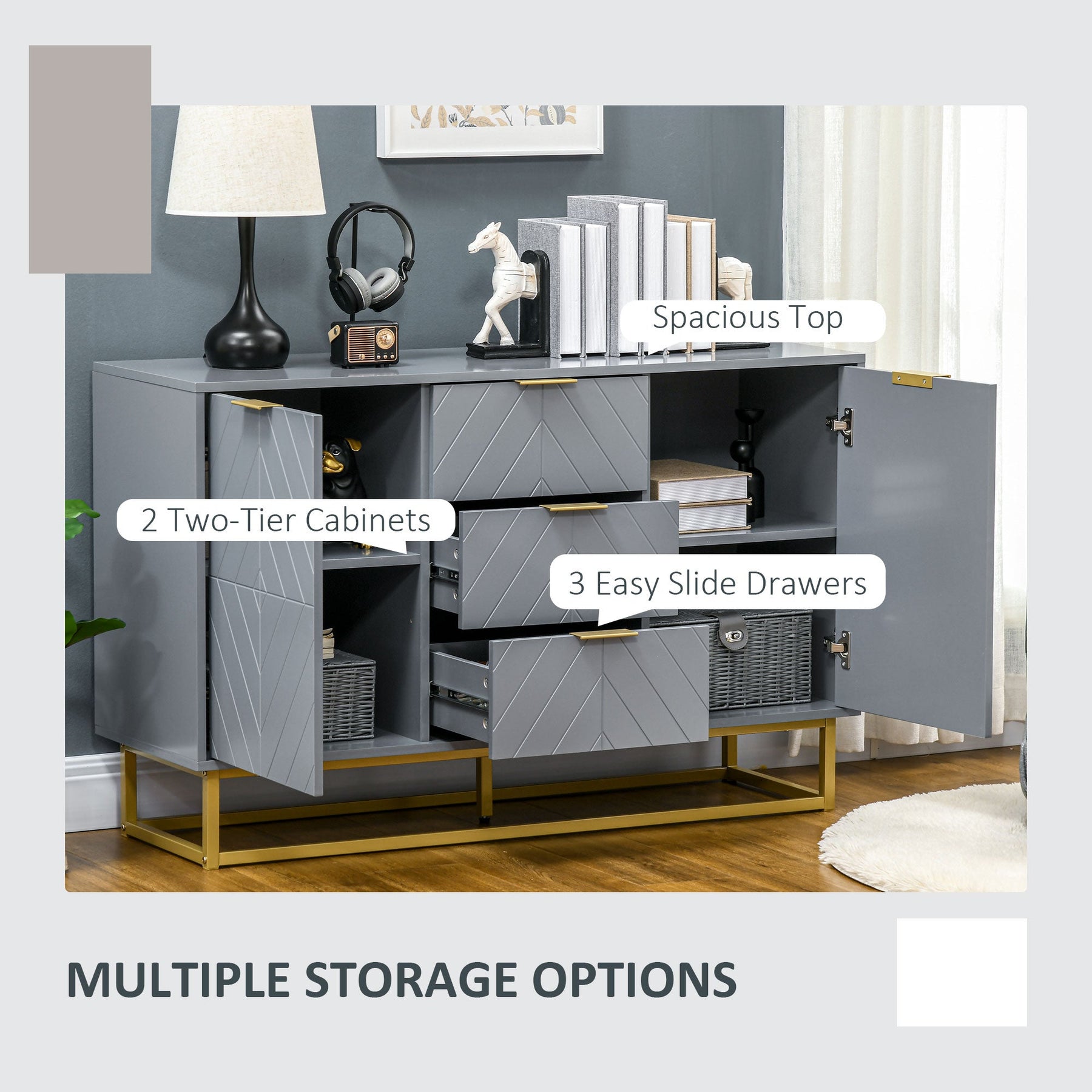 Elevate your home decor with this elegant sideboard, featuring geometric doors with golden accents for a sophisticated touch. Perfect for the living room, kitchen, or any space needing a modern update. With versatile storage, it includes three smooth slide drawers for small accessories and a two-door cabinet with ample space for daily supplies. The large top can be used as a coffee bar or for displaying decorative items. Inside, two adjustable shelves provide customizable storage solutions. Crafted from durable MDF and metal, this cabinet ensures stability with an anti-tipping kit and extra bottom leg for safety. A stylish and functional addition to any home.