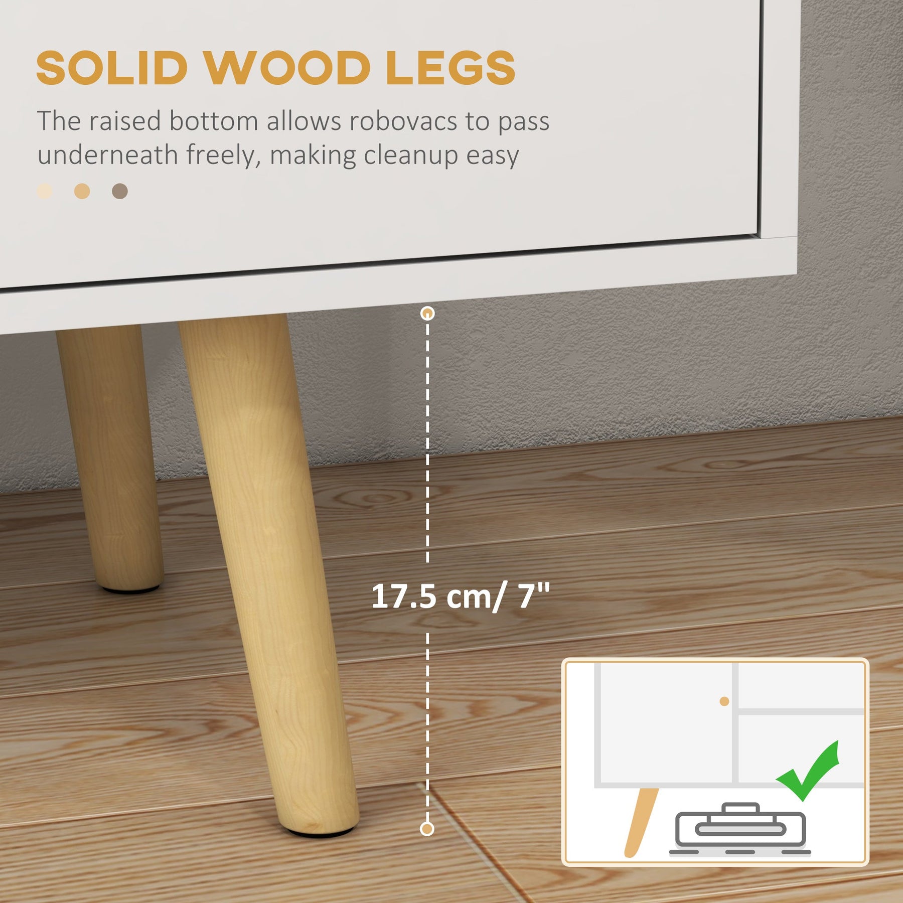 This minimalist-style TV stand is both functional and stylish, making it a perfect addition to your living room. It supports TVs up to 55 inches and provides ample storage space with two open shelves and two cupboards with doors for your media devices, games, and DVDs. The built-in cable management system keeps cords hidden and organized, ensuring a clean, clutter-free setup. Supported by solid wood legs, this TV unit is both stable and durable, with a raised bottom that allows easy access for robotic vacuums. The overall design is versatile and pairs well with various furniture styles, ensuring a sleek and tidy entertainment area.
