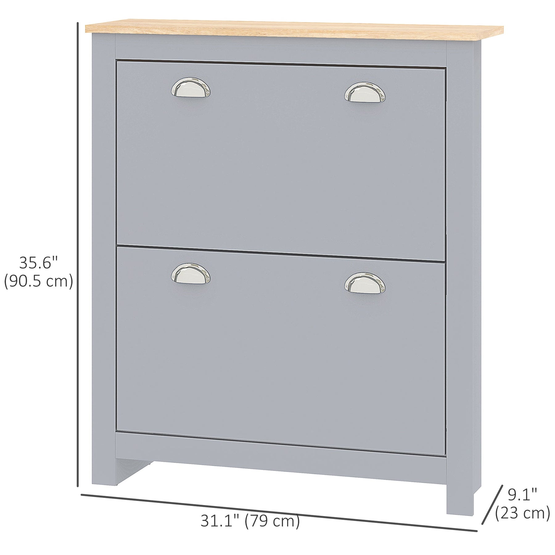 Ample Storage: Two flip drawers with 2-level adjustable shelves each, holding up to 6 pairs of shoes. The tabletop offers extra space for displays or keys.