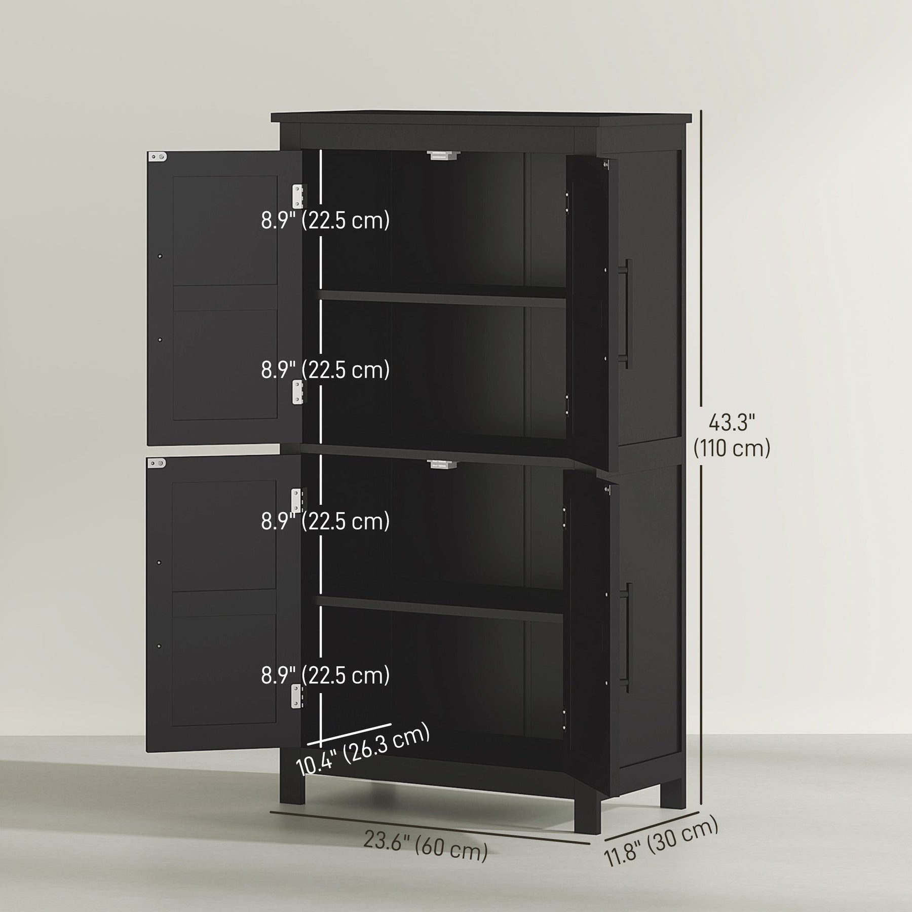Maximize your bathroom storage with this spacious and stylish bathroom cabinet, designed to keep your space neat and organized. Featuring a four-shelf design hidden behind four doors, this cabinet provides ample room for towels, toiletries, and everyday essentials. Two adjustable shelves with three height levels allow you to customize the storage layout to suit your needs, ensuring versatility for different-sized items. Designed with a charming farmhouse aesthetic, this freestanding cabinet showcases barn-style doors and black metal bar handles, adding a rustic yet modern touch to any room. Constructed from durable MDF, this cabinet is built for long-lasting stability. It includes protective foot pads to prevent floor damage and an anti-tipping design for enhanced safety. With overall dimensions of 23.6 inches long, 11.8 inches wide, and 43.3 inches high, this storage cabinet is a perfect solution for bathrooms, laundry rooms, or any space needing extra organization. Assembly is required.