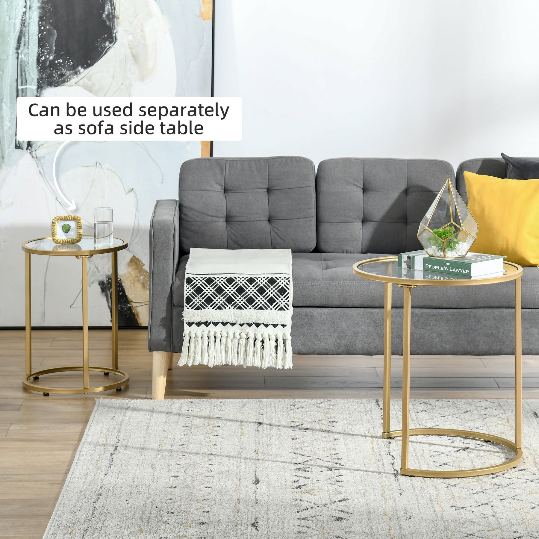 Upgrade your living space with this modern and simple nesting coffee table set, featuring a sleek gold metal frame and tempered glass tabletop. The minimalist round design creates a fresh and comfortable ambiance, making it perfect for any room—whether it’s the living room, bedroom, office, dorm, or reception area. These versatile nesting tables can be used separately or stacked together to save space. With adjustable foot pads, they stay balanced even on slightly uneven floors while protecting against scratches. Whether used as a coffee table, nightstand, or side table, this functional and stylish set is a perfect addition to your home.