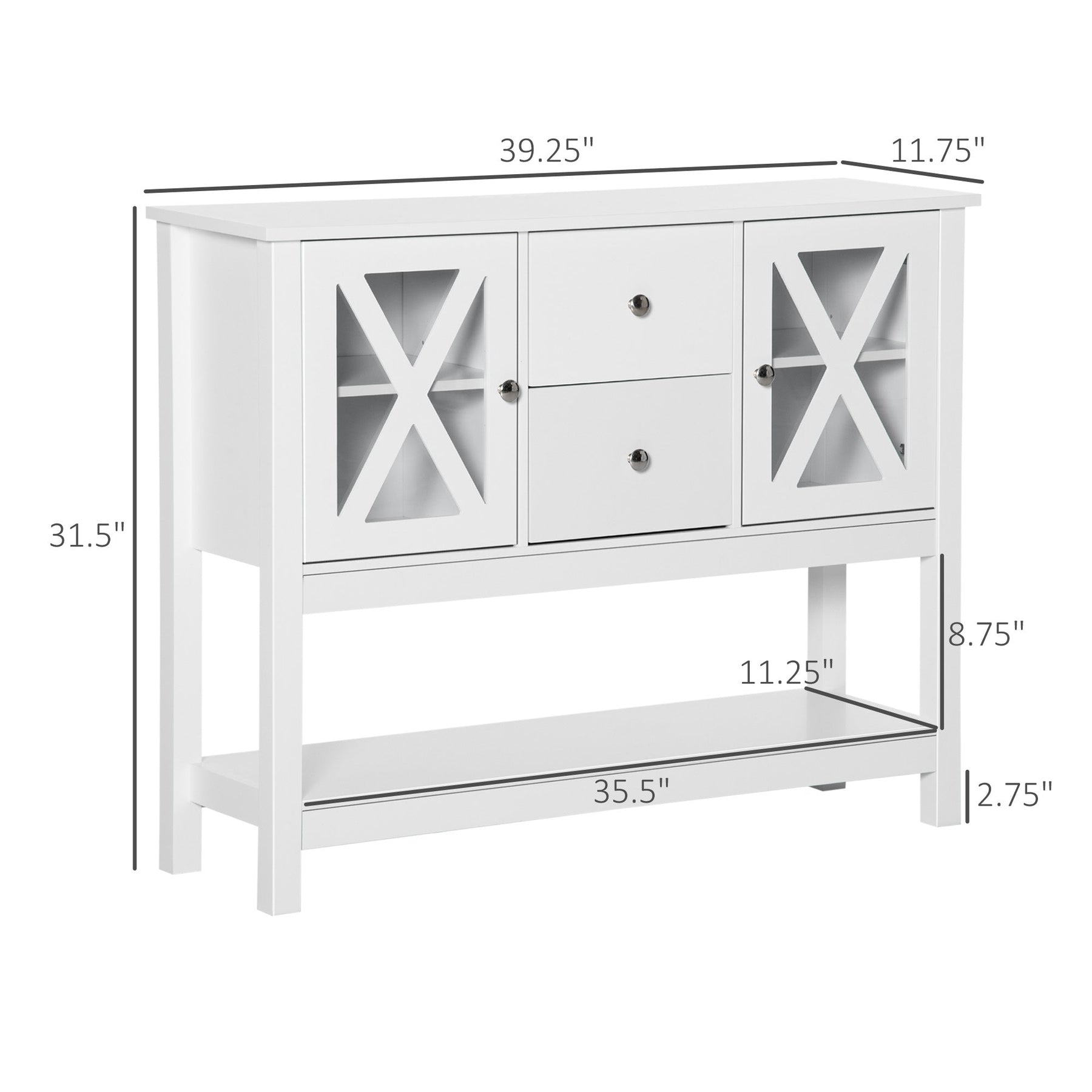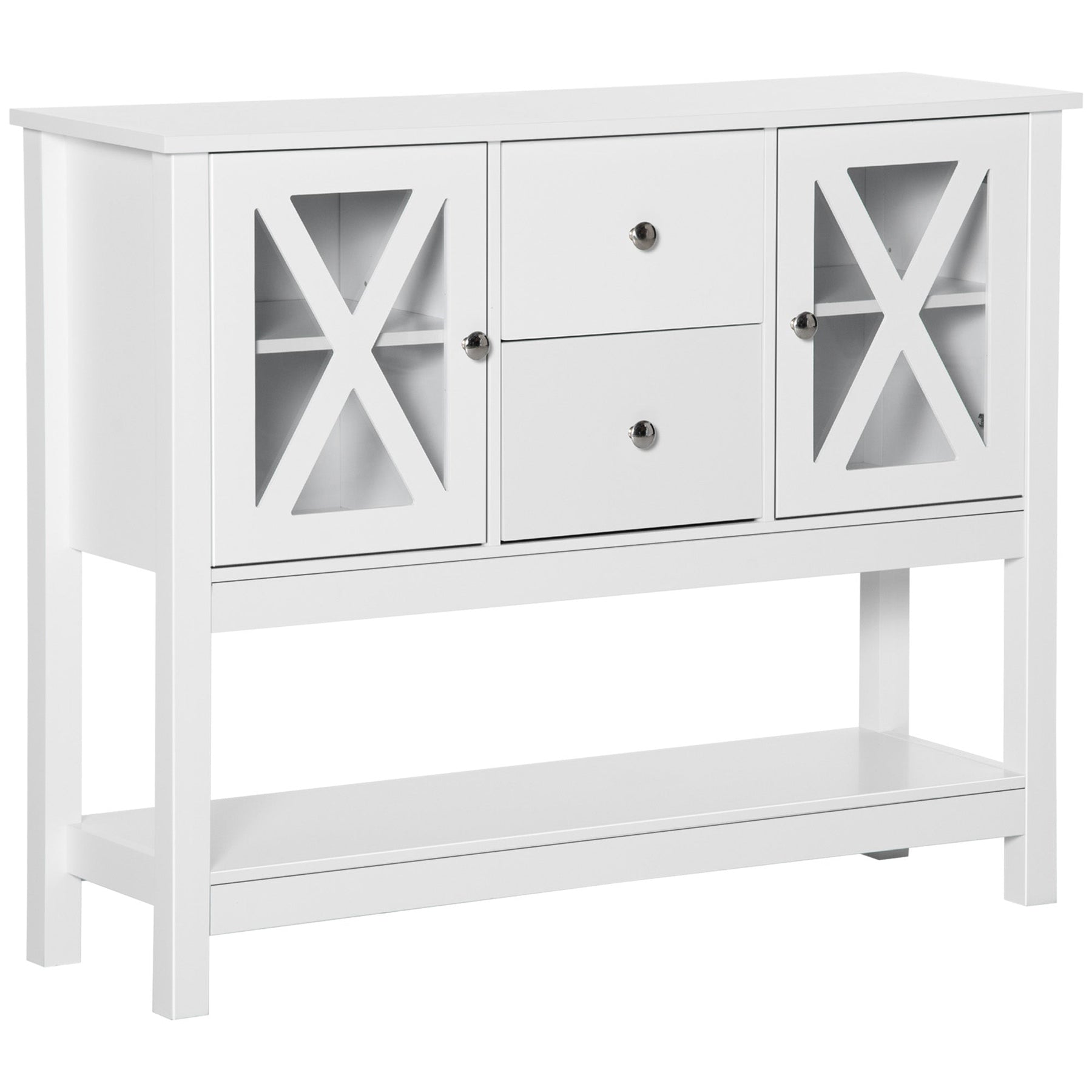 Enhance your home with this stylish sideboard, featuring an elegant rustic design with tempered glass doors and X-shaped detailing for a charming touch. With two drawers, two cabinets, and an open shelf, this storage unit offers a versatile organization solution for any room. Use it as a buffet cabinet in the dining area, a coffee bar in the living room, or a storage cabinet in your kitchen or entryway. The adjustable shelf allows for customizable storage, while the anti-tip design ensures stability and safety. Crafted from smooth MDF for durability and easy maintenance, this sideboard seamlessly combines style and functionality.