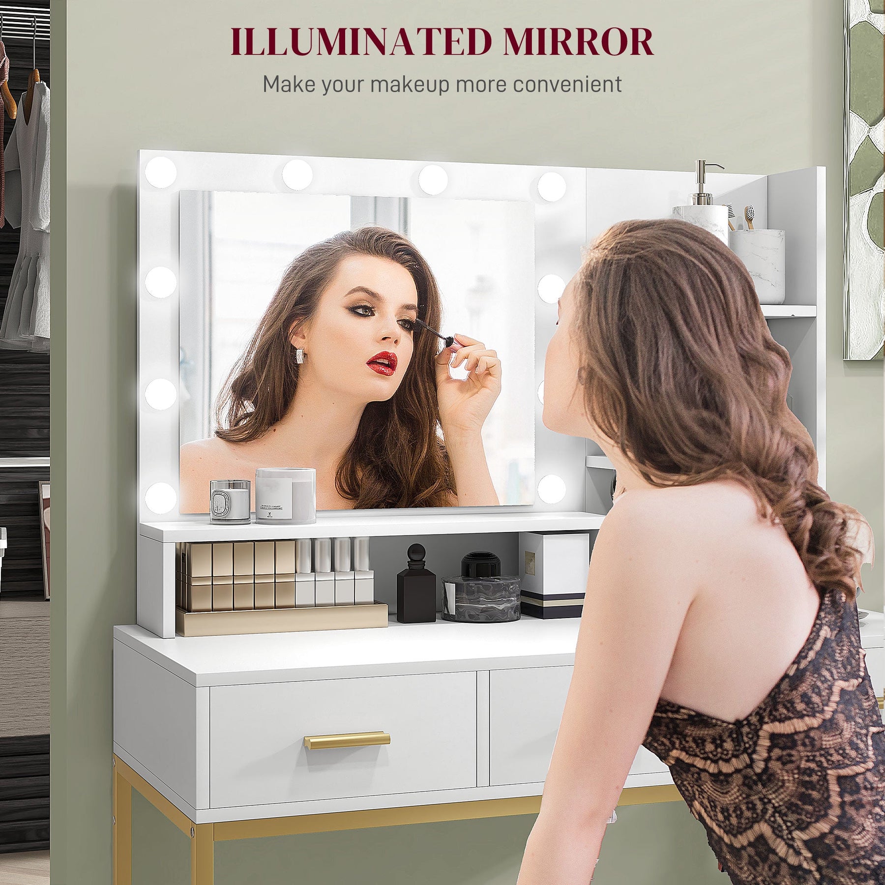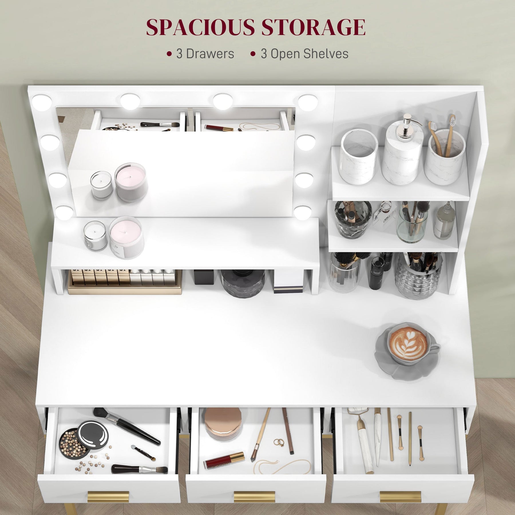 Enhance your bedroom, cloakroom, or locker room with this elegant and functional vanity set. Featuring a spacious dressing table with a large illuminated mirror, this vanity provides ample storage space with 3 drawers and 3 open shelves to keep your cosmetics and perfumes organized and easily accessible. The smooth three-part steel drawer slides ensure effortless opening and closing, while the 10 LED bulbs surrounding the mirror provide perfect lighting for makeup application day or night. Designed with a stylish gold base and handles, this vanity blends seamlessly with any décor, offering both sophistication and utility. Its solid steel frame and MDF with melamine surface ensure durability, while non-slip foot pads protect your floors from scratches. This vanity set is a perfect addition to your home for a modern and organized beauty routine.