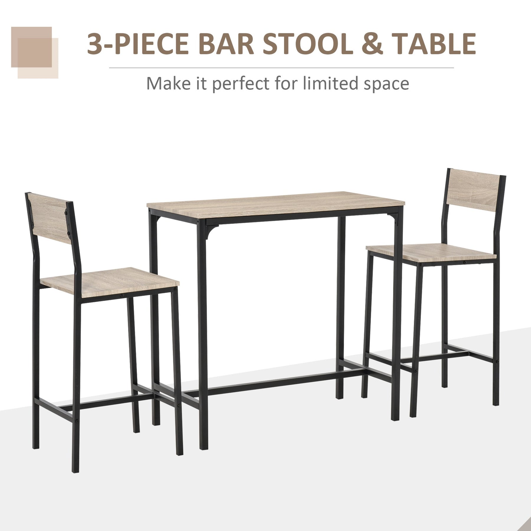 Perfect for both outdoor and indoor settings, this 3-piece kitchen table with chairs set brings a simple yet classic design to any space. Whether used for casual dining or entertaining guests, its versatility makes it a perfect addition to your home or patio. The table and stools are built with a sturdy, high-quality MDF top on a galvanized steel frame, ensuring years of durable use. The comfortable bar stools feature tall, high backs with built-in footrests, providing extra support and relaxation for long periods of sitting. Easy to maintain with a scratch- and water-resistant MDF top, this set will look brand new with minimal upkeep.