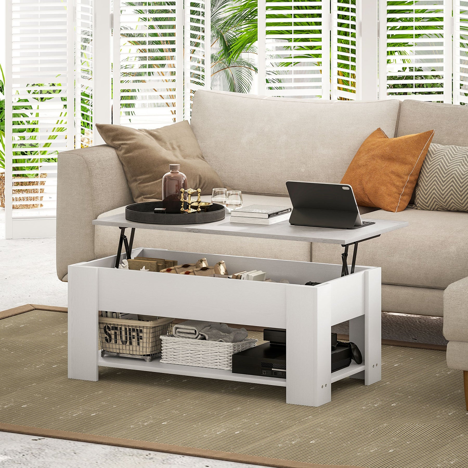 Hidden Storage: Under the tabletop, a compartment stores magazines, laptops, remote controls, and game controllers. The open bottom shelf is perfect for storing blankets and books.