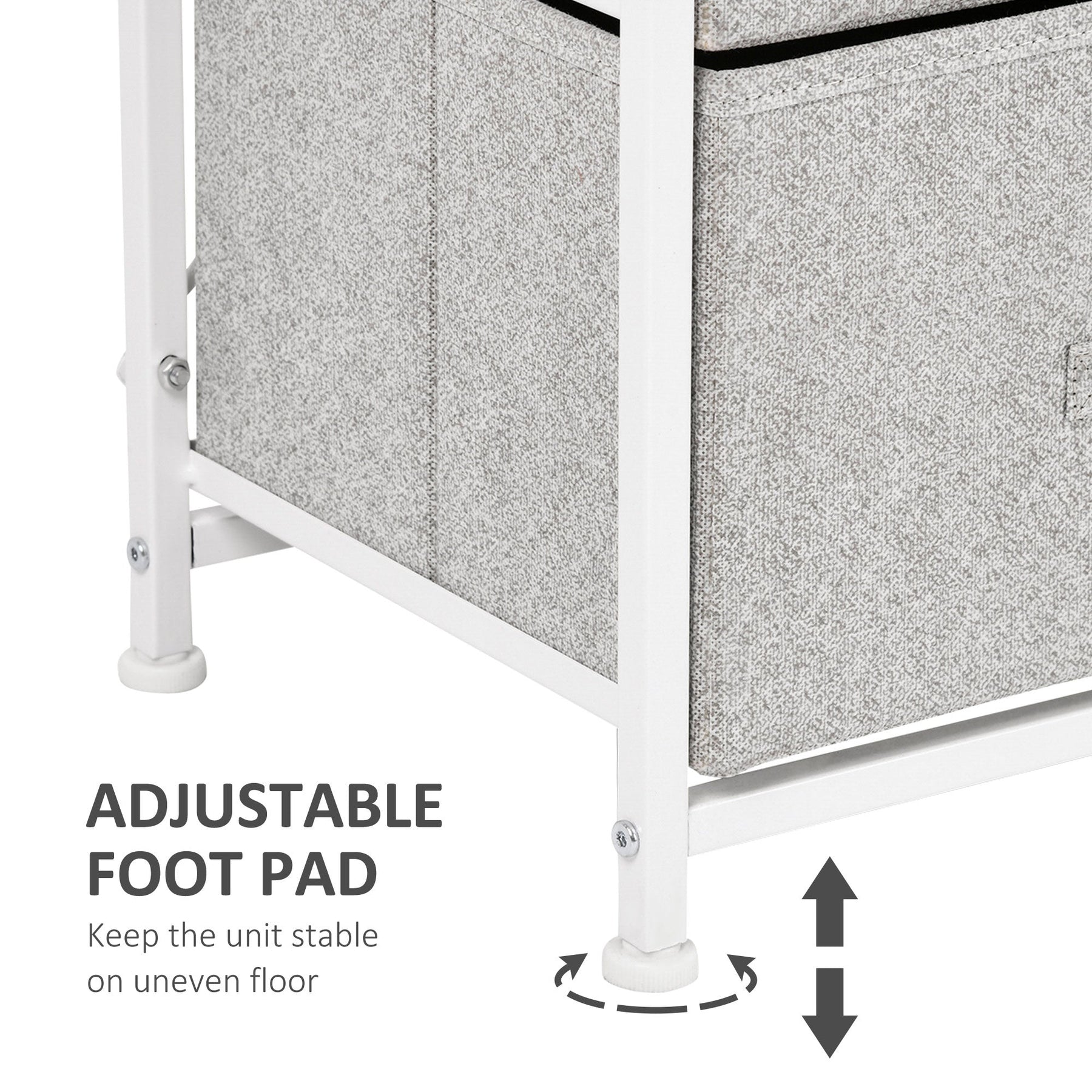 This sleek fabric dresser features 4 linen-patterned drawers combined with a white MDF top and a sturdy steel frame, making it an ideal addition to your living room, entryway, or any other space in your home. The top board offers extra storage for photos and small items, while the four removable drawers provide ample space to organize home or office supplies, toys, books, and more. Crafted with a powder-coated steel frame and an MDF top, this dresser is durable and designed to last. The reinforced linen fabric drawers resist sagging, ensuring smooth pulls every time. For added stability, the back features a cross bar, and the anti-slip feet protect your floors while keeping the dresser securely in place on uneven surfaces.