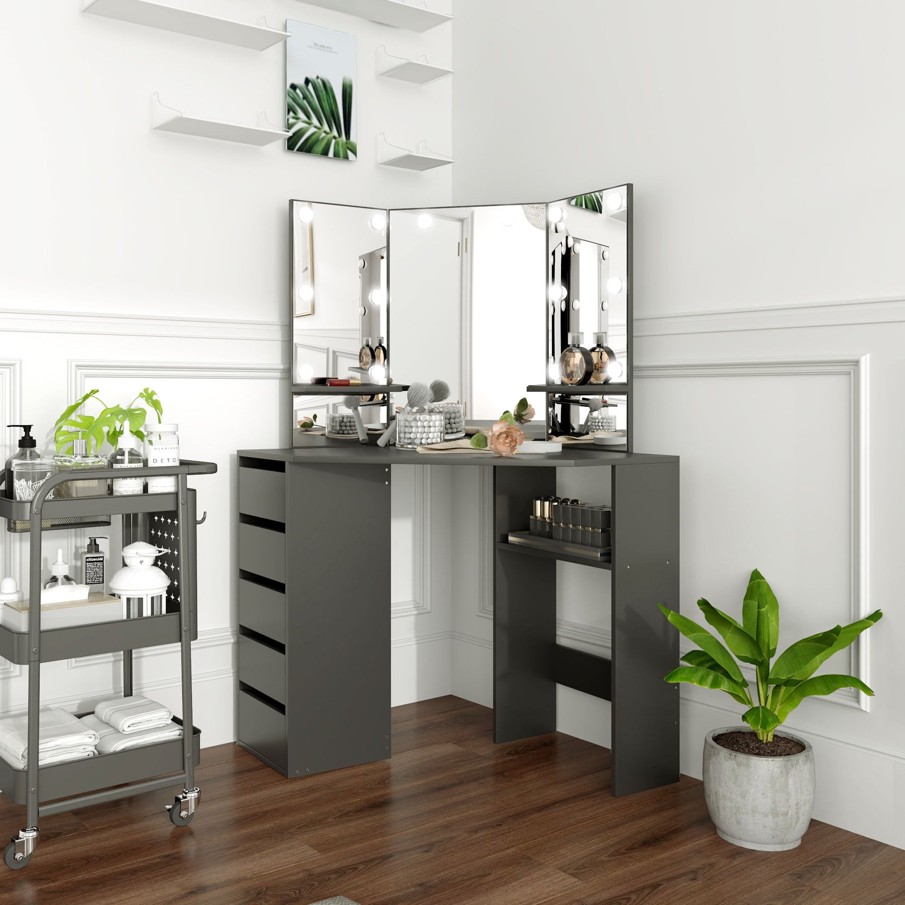 Transform your beauty routine with this elegant and functional vanity table set. Equipped with 10 removable USB-powered LED bulbs that emit a warm white light, this dressing table provides a flattering glow for your makeup application. The triple-panel mirror design allows for clear views from multiple angles, making it easy to apply makeup or style your hair with precision. With a spacious tabletop, two mirror shelves, five drawers, and a bottom open shelf, this vanity desk offers plenty of storage to organize your beauty essentials. The space-saving corner design makes it an ideal choice for small apartments or bedrooms, fitting seamlessly into any corner while maintaining a stylish appearance. Crafted from veneer particleboard, this vanity table is designed with stability and safety in mind, featuring an anti-tipping design and non-slip foot pads for added security.