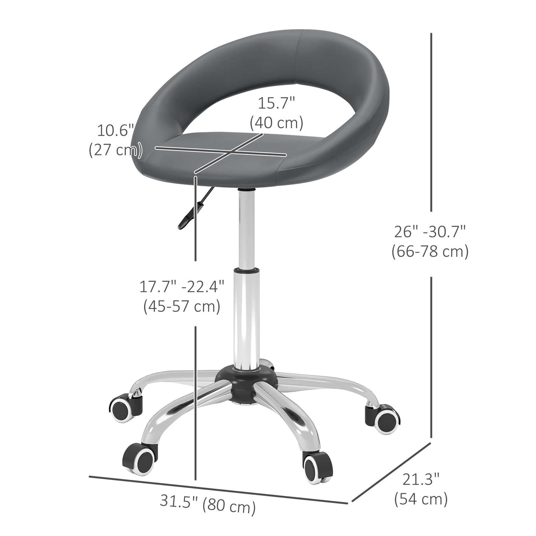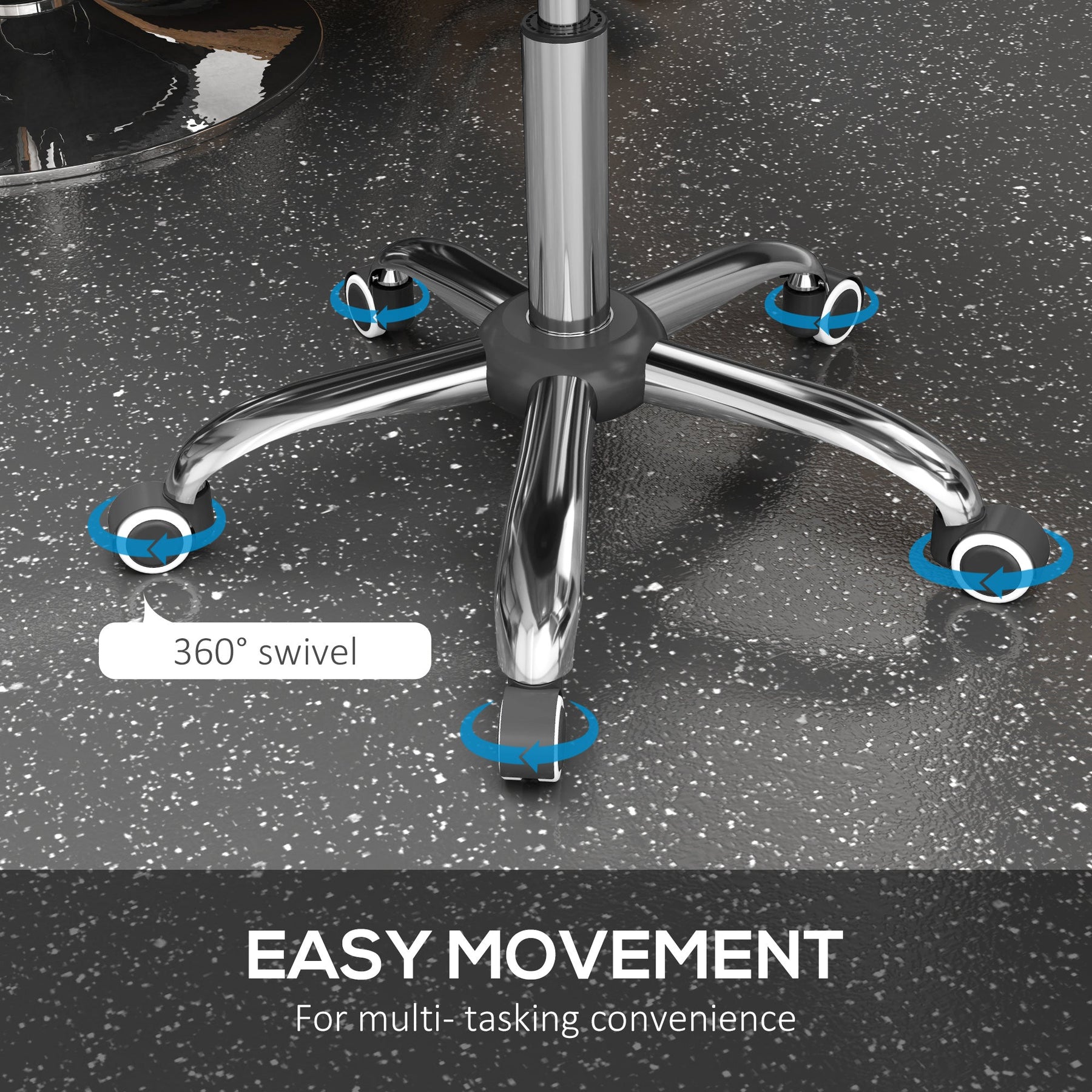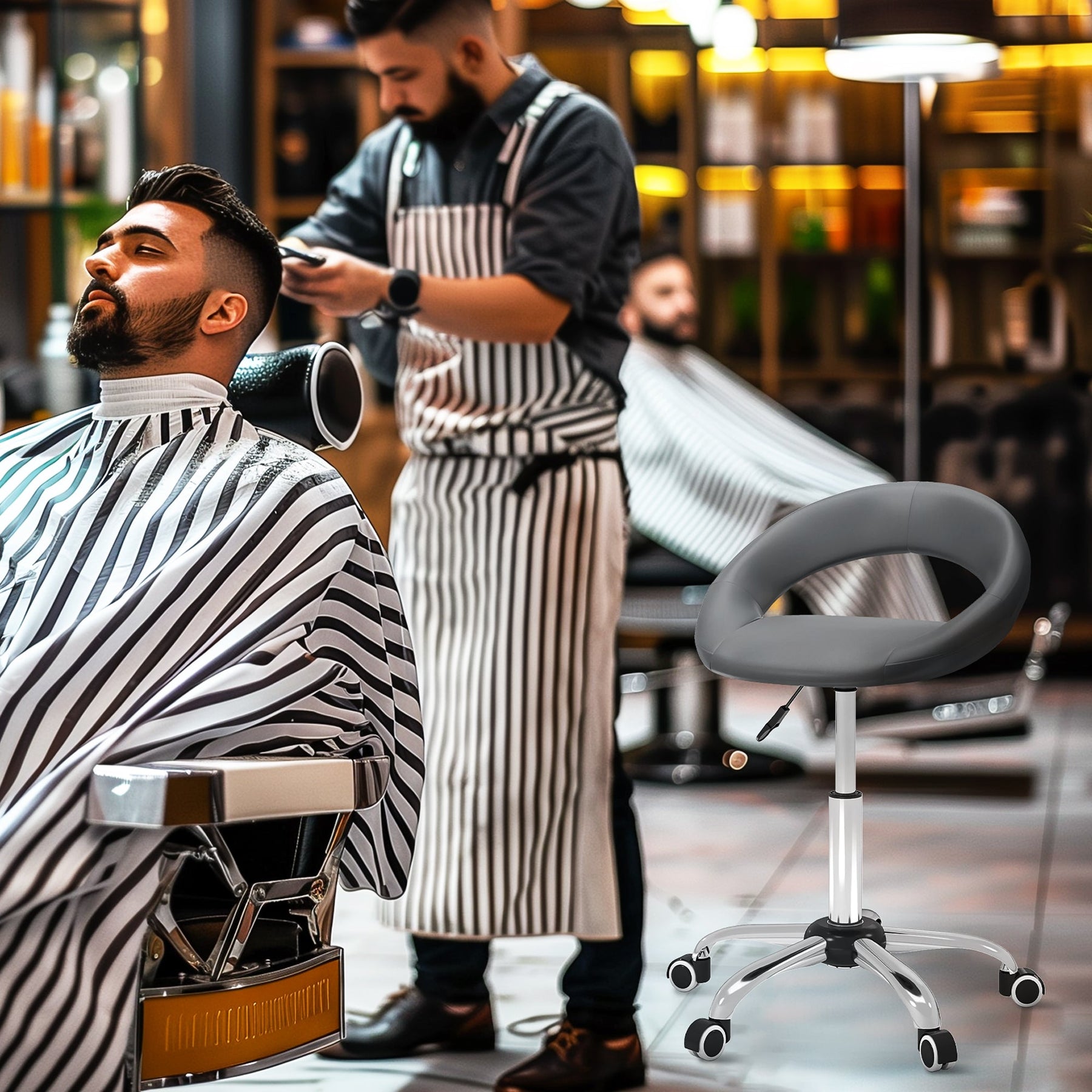 Enhance your workspace with this adjustable rolling stool, designed for comfort, flexibility, and style. Ideal for salons, barber shops, tattoo parlors, beauty studios, medical offices, and even home use, this stool offers a height-adjustable seat ranging from 26" to 30.75" (66-78 cm) to help you achieve the perfect leg angle. The foam-padded PU upholstery provides lasting comfort, while the orbit-designed backrest offers excellent spinal support. Equipped with smooth-rolling wheels and a 360° rotatable seat, this stool ensures effortless movement, allowing you to reach everything within arm’s length without leaving your chair. Built with durability in mind, it supports up to 300 lbs. (136 kg) and is easy to assemble.