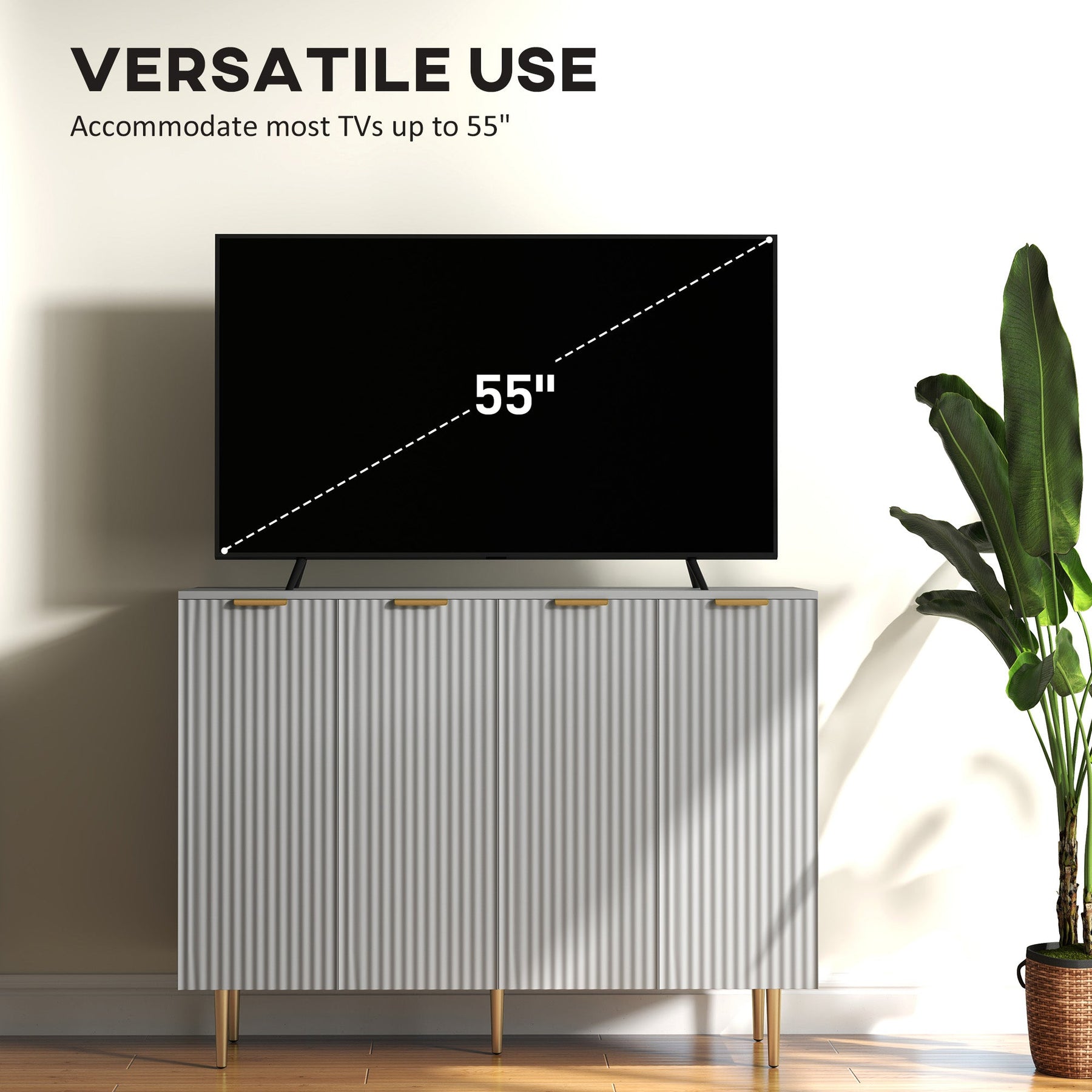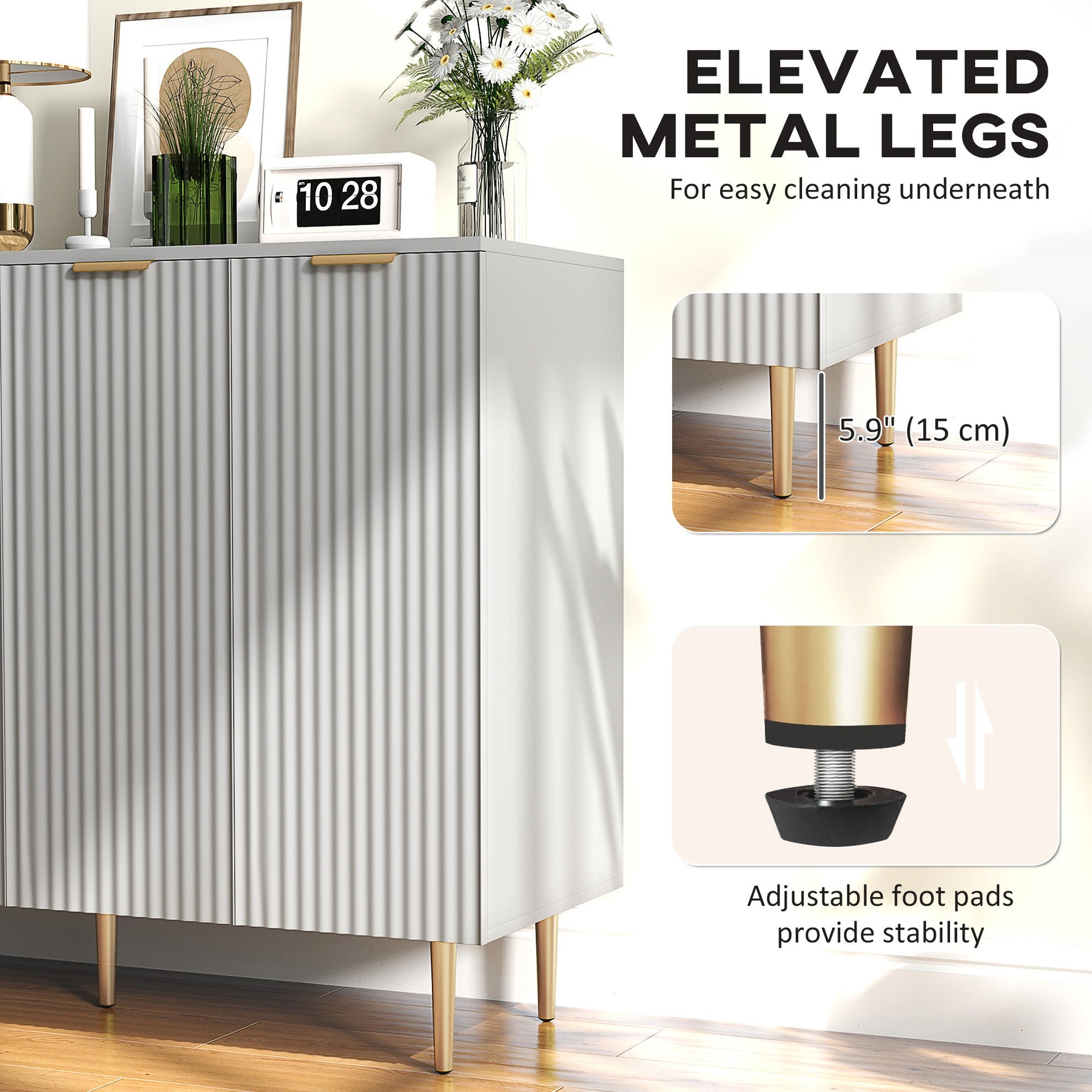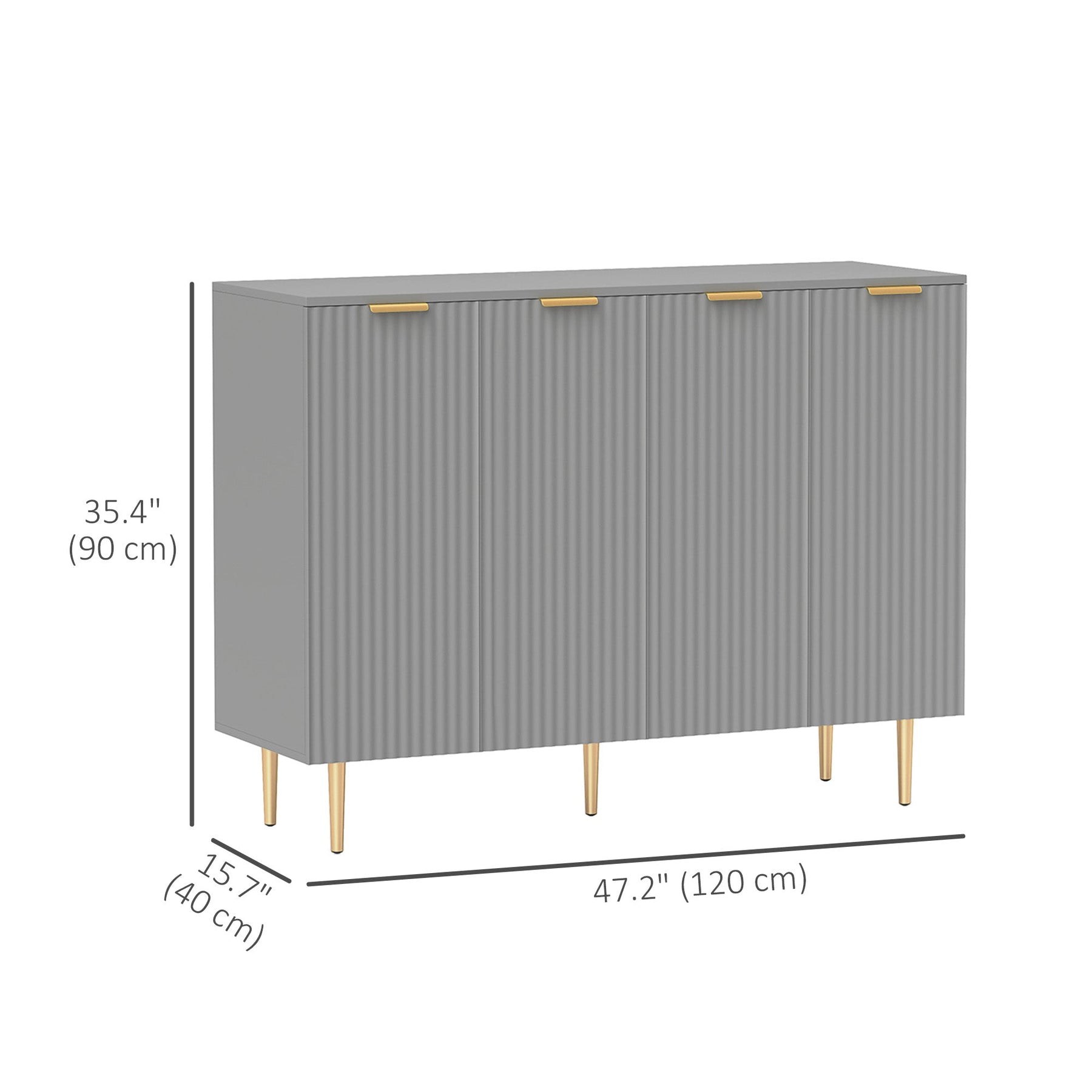 This buffet cabinet offers a spacious and efficient storage solution for your kitchen, dining room, or living space. Featuring two double-door cabinets, it provides ample space to store daily accessories, utensils, and other items, enhancing your kitchen storage capabilities. The cabinet includes adjustable inner shelves that can be set to three different heights, offering flexibility to accommodate items of varying sizes. Its elegant fluted design adds a modern touch to your home, making it an ideal choice as a stylish sideboard or chic coffee cabinet. Crafted from durable painted MDF, this buffet cabinet is easy to maintain and built for longevity. The elevated metal legs allow for effortless cleaning, and the anti-tipping design ensures safety and stability. Additionally, the adjustable foot pads further enhance the cabinet's stability, making it both a practical and beautiful addition to your home. With overall dimensions of 47.2"W x 15.7"D x 35.4"H and a weight capacity of 260 lbs, it’s a versatile and sturdy piece that blends form and function seamlessly.