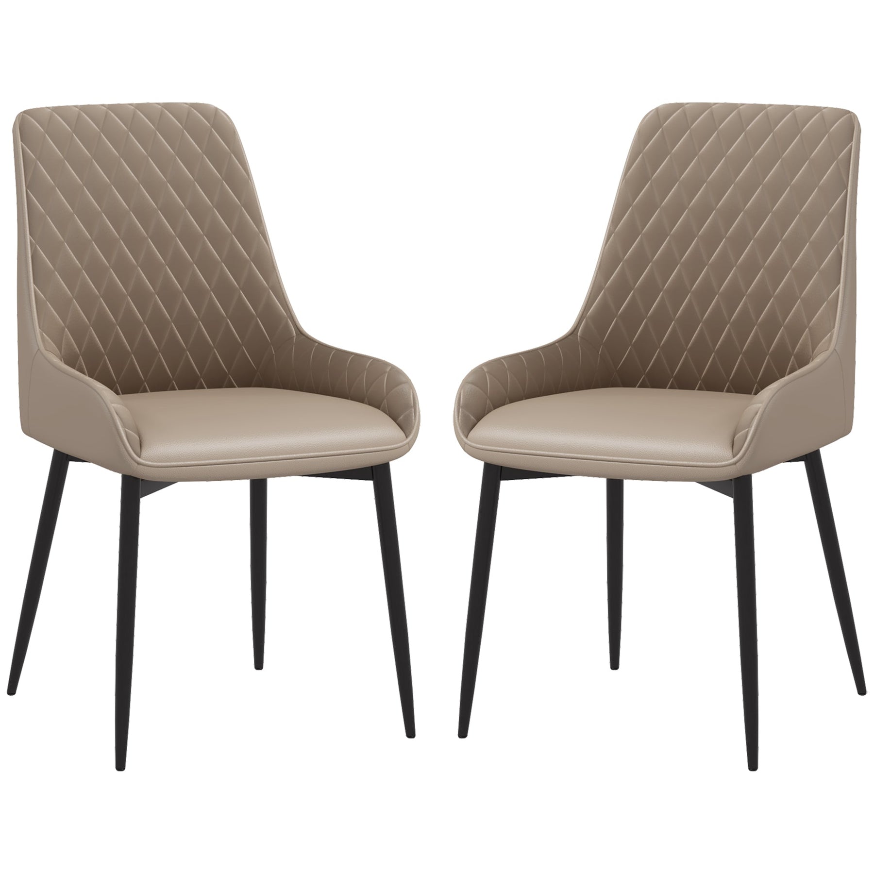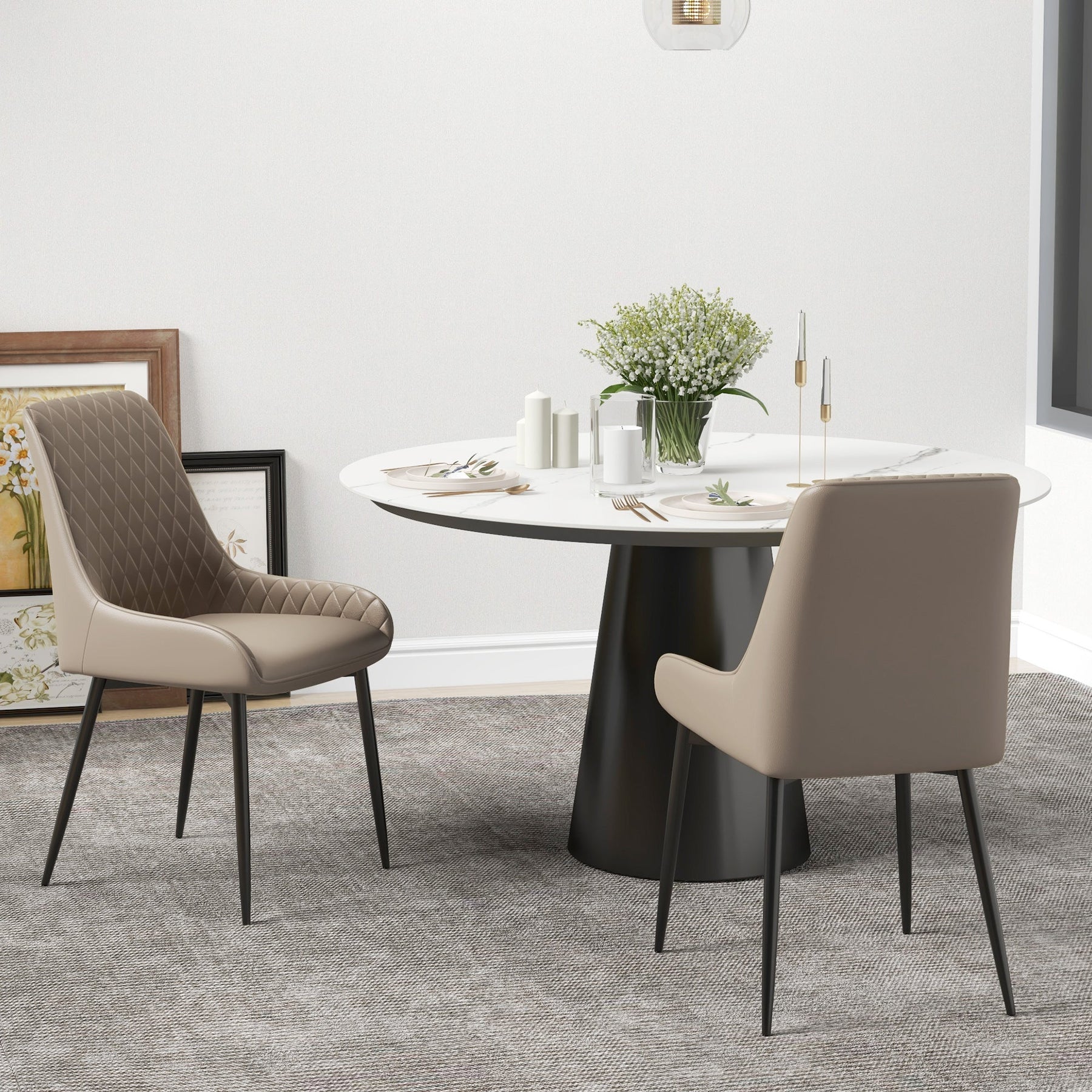 Enhance your dining room or living space with these stylish and comfortable kitchen chairs, designed to provide both durability and relaxation. Built with powder-coated steel legs, these chairs offer exceptional stability and can support up to 330 lbs, ensuring long-lasting reliability. The luxurious PU leather surface resists wear and water, making them easy to maintain and perfect for daily use. The ergonomic design, combined with high-density sponge padding and a high backrest, provides optimal comfort, allowing you to sit back and relax for hours. Equipped with non-slip protective foot pads, these chairs prevent slippage and protect sensitive flooring surfaces from scratches. The diamond tufting adds an elegant, modern touch, while the generous size accommodates various body shapes, making them versatile enough for use as dining chairs, makeup chairs, side chairs, or even home office chairs. With overall dimensions of 19.3" W x 23.6" D x 35" H, these chairs provide both style and function for any space.