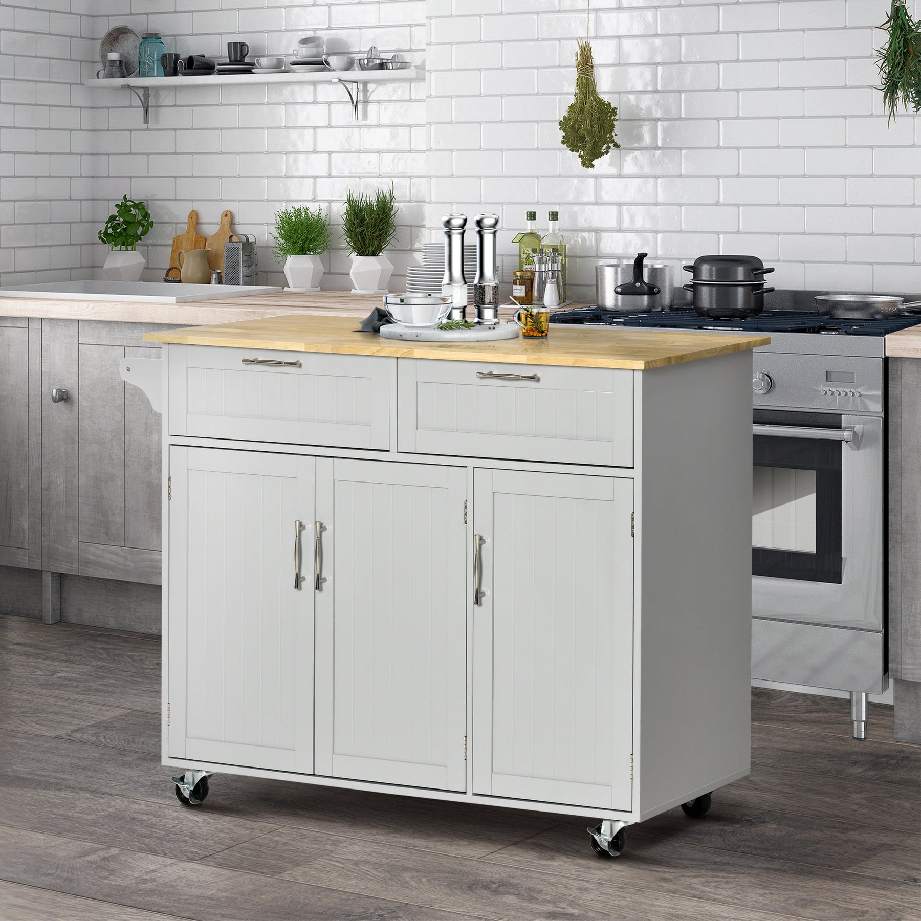 This versatile kitchen island cart offers an ideal solution for storage and organization. Featuring two easy-glide drawers, concealed cabinets with adjustable shelves, and a towel bar, this kitchen cart provides ample space for various kitchen utensils and supplies. The shelves can be fixed at three different levels to fit your needs. With its modern style, solid rubberwood tabletop, and MDF side panels, this piece is perfect for your kitchen, dining room, or hallway. Mobility is made easy with four smooth-rolling casters, two of which are equipped with brakes to keep the cart securely in place. Crafted for durability and easy maintenance, this microwave stand is perfect for adding both function and style to your space.