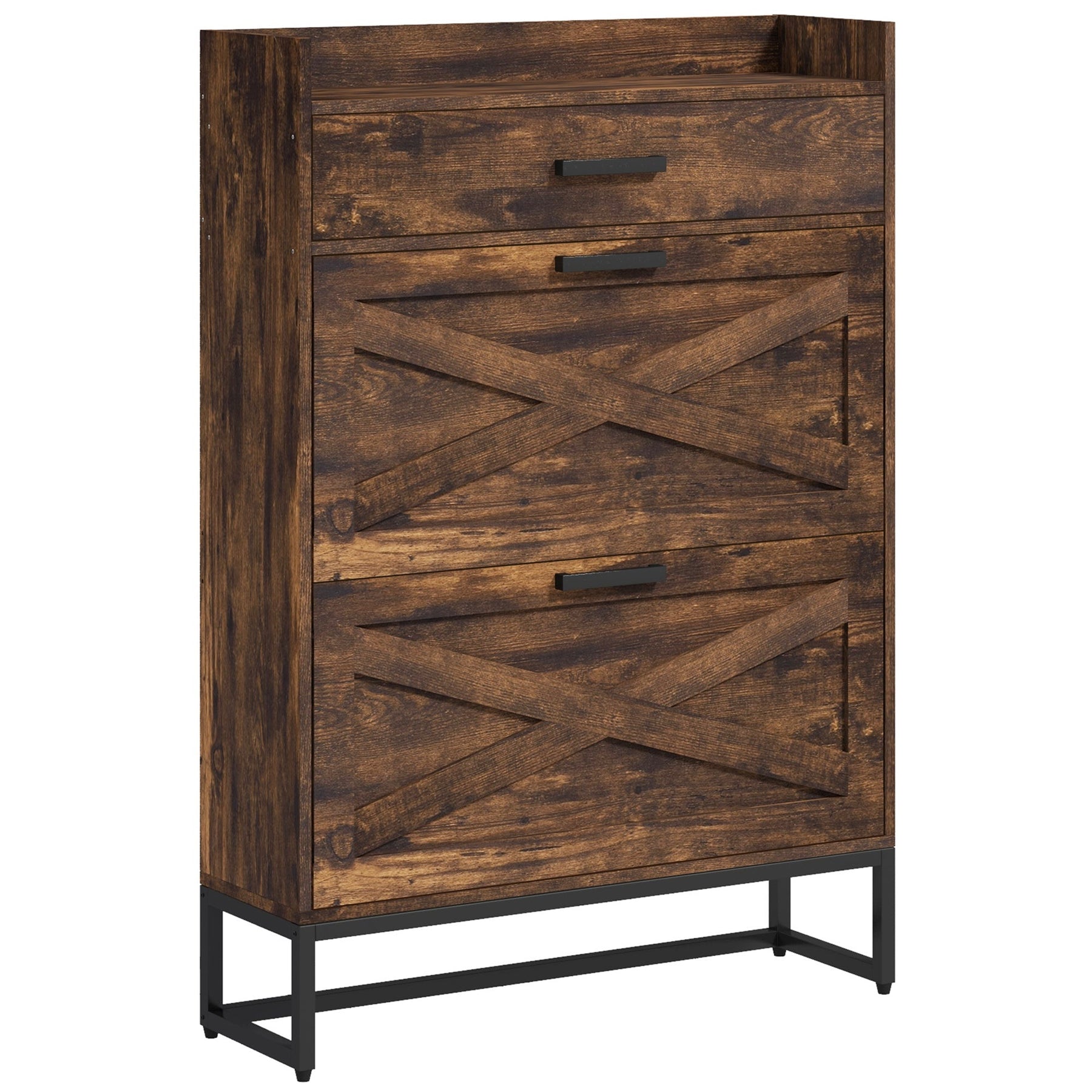 Maximize your entryway's functionality with this practical and space-saving shoe cabinet. Featuring two flip drawers and a top drawer, this cabinet offers plenty of room for storing shoes, keys, and accessories while maintaining a compact design that fits easily into narrow hallway spaces. The flip drawers are equipped with 3-level adjustable shelves, allowing you to customize the interior for up to 12 pairs of shoes (Max Shoe Size: CA Men Size 10.5). The flat tabletop provides additional space to display knick-knacks or photo albums, adding a personal touch to your entryway. Built with a robust particle board frame and powder-coated steel base, this shoe rack is stable and durable. Its anti-tipping design ensures safety, especially in homes with children and pets. The industrial-style barn doors bring a modern charm that blends well with various home decors, making it a perfect addition to your entryway or hallway.