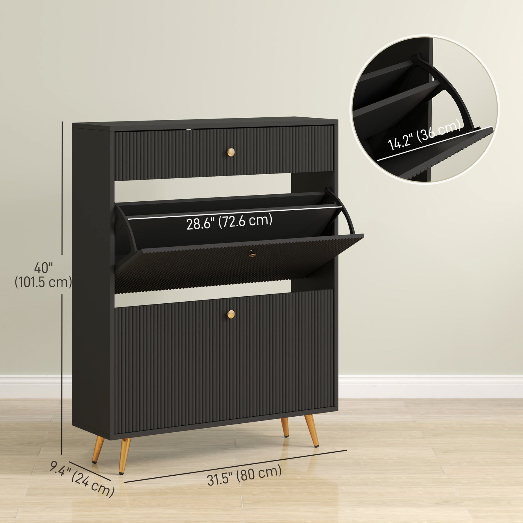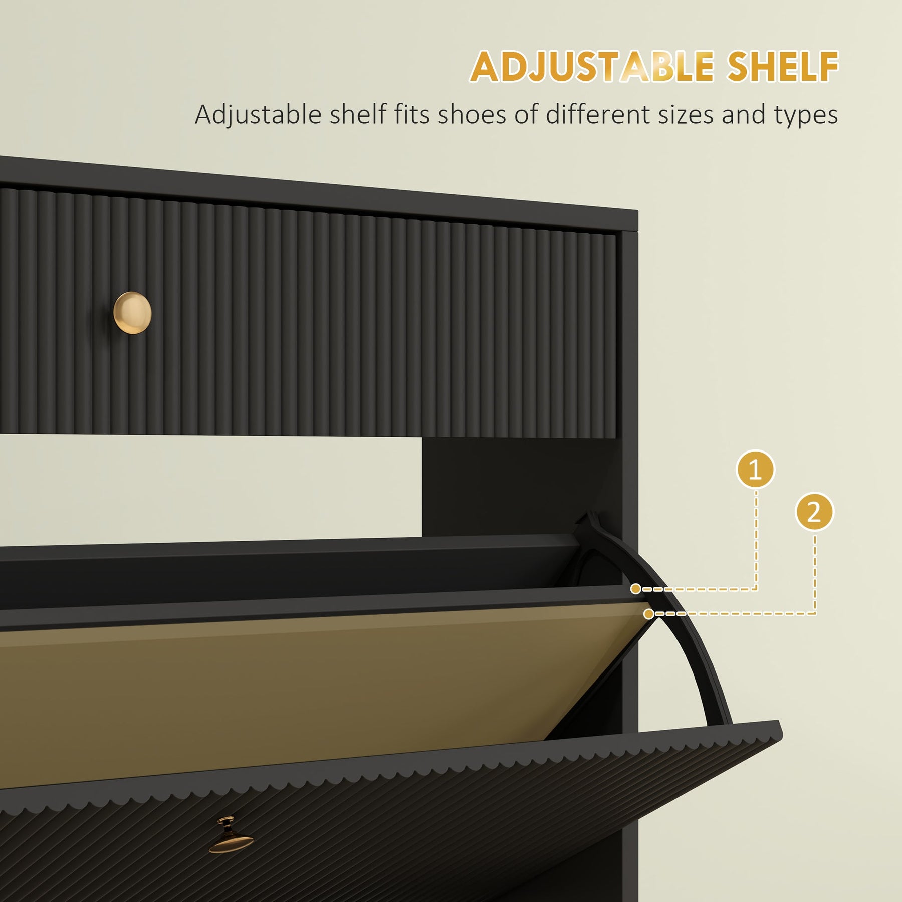 Add a touch of modern elegance to your entryway or living room with this slim shoe cabinet. Featuring a sleek black finish, wave-like fluted panels, and gold handles, this cabinet serves both as a functional storage solution and a stylish accent piece. With two flip drawers that hold up to 12 pairs of shoes and an additional small drawer for everyday essentials, this piece optimizes space without compromising on style. The adjustable and removable shelves allow for flexible organization, fitting various shoe sizes and styles. Designed with an anti-tipping feature, this shoe storage cabinet ensures stability and safety, offering peace of mind in your home.