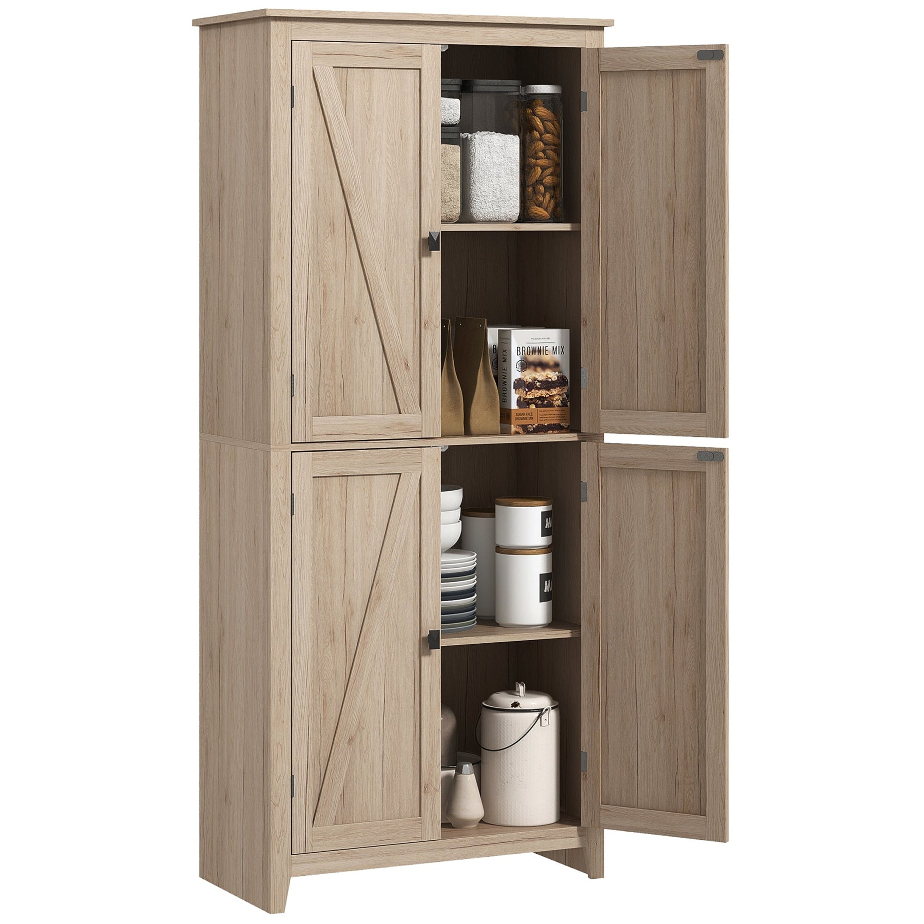 Bring a touch of rustic elegance to your home with this farmhouse-style kitchen storage cabinet, designed with charming barn doors and black square handles to complement any décor. Featuring magnetic catches, the doors close securely, keeping your items protected and dust-free. With four-tier shelving, this spacious pantry cabinet provides ample room to organize dishes, pots, pans, and small appliances. The two adjustable shelves offer three height options, allowing you to customize storage to fit taller items. Built with a high-quality MDF frame, this tall cabinet ensures durability and stability, reinforced with an anti-tipping design for added safety. The smooth surface allows for easy cleaning, making it a practical and stylish addition to your kitchen, dining room, or pantry. Measuring 31.5 inches wide, 15.7 inches deep, and 71.7 inches high, this pantry storage cabinet supports up to 88 lbs overall, with each shelf holding up to 33 lbs. Assembly is required, making this a functional and stylish solution for all your kitchen storage needs.