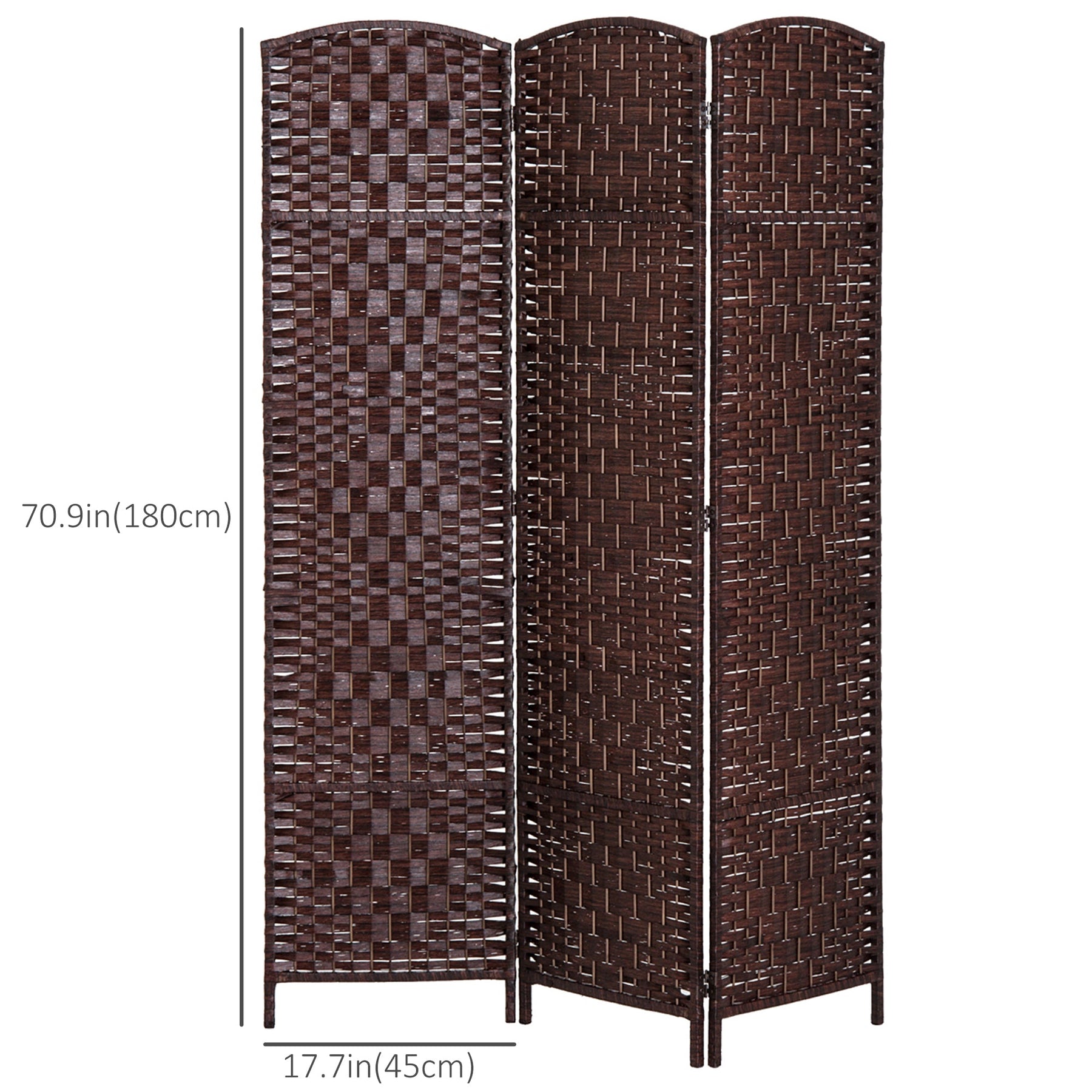This stylish privacy partition is the perfect solution for creating instant temporary privacy in any space. Thoughtfully designed to cater to the average height of most individuals, it effectively divides large rooms or creates a smaller, enclosed private area within a single room. Featuring a hand-woven design with a wood frame and a diamond-shaped woven rattan pattern, this partition adds a natural, chic touch to your living room, bedroom, or home office. The bent wood arched top enhances its aesthetic appeal, making it not only a functional item but a decorative accent as well. Made from selected materials, this room divider is constructed with double-sided woven rattan, a solid wood frame, and metal hinges, ensuring durability and smooth operation while allowing air circulation. The double-hinged design allows for flexible positioning, letting you adjust the panels to any direction and change the layout easily. When not in use, the lightweight design allows for easy storage in corners, saving space.