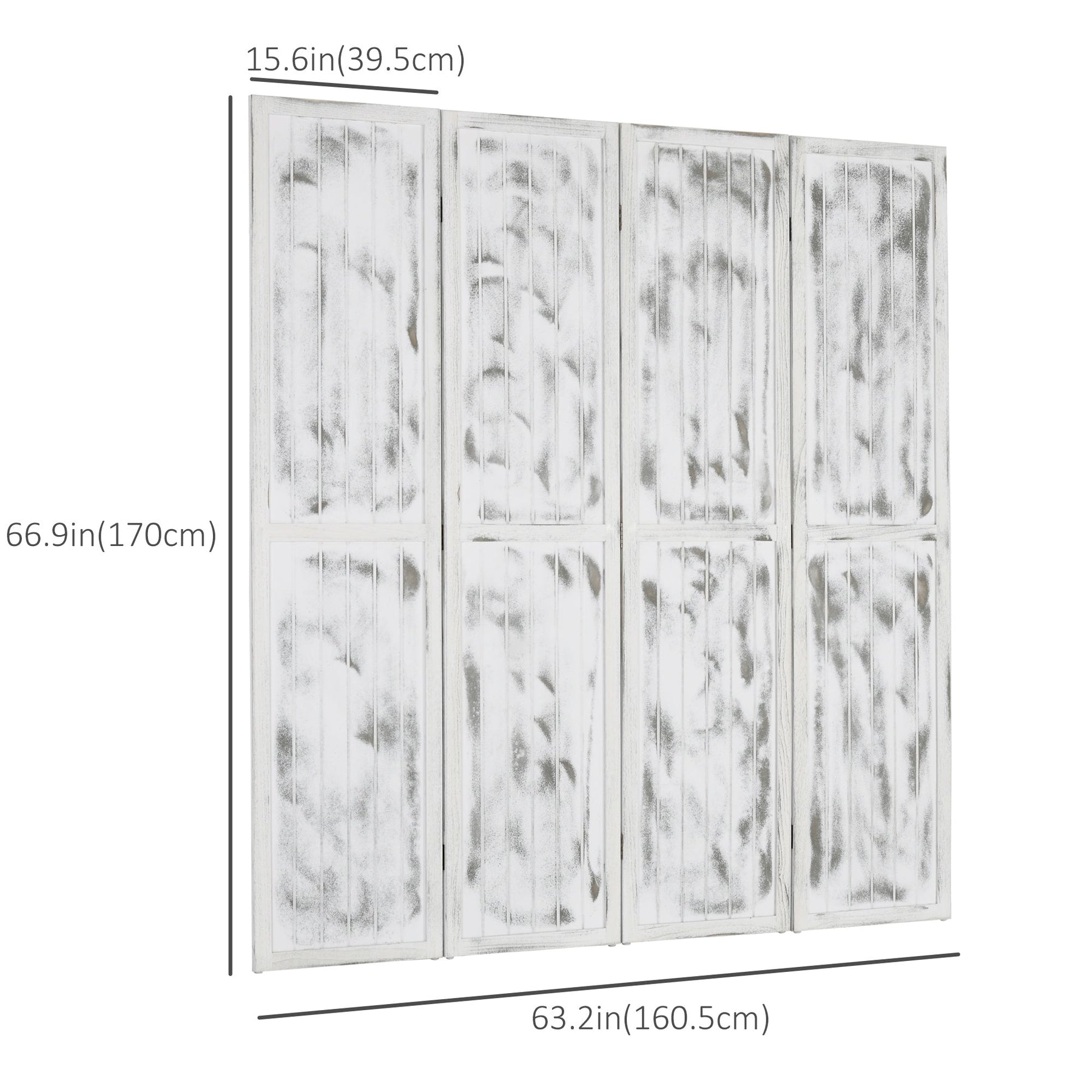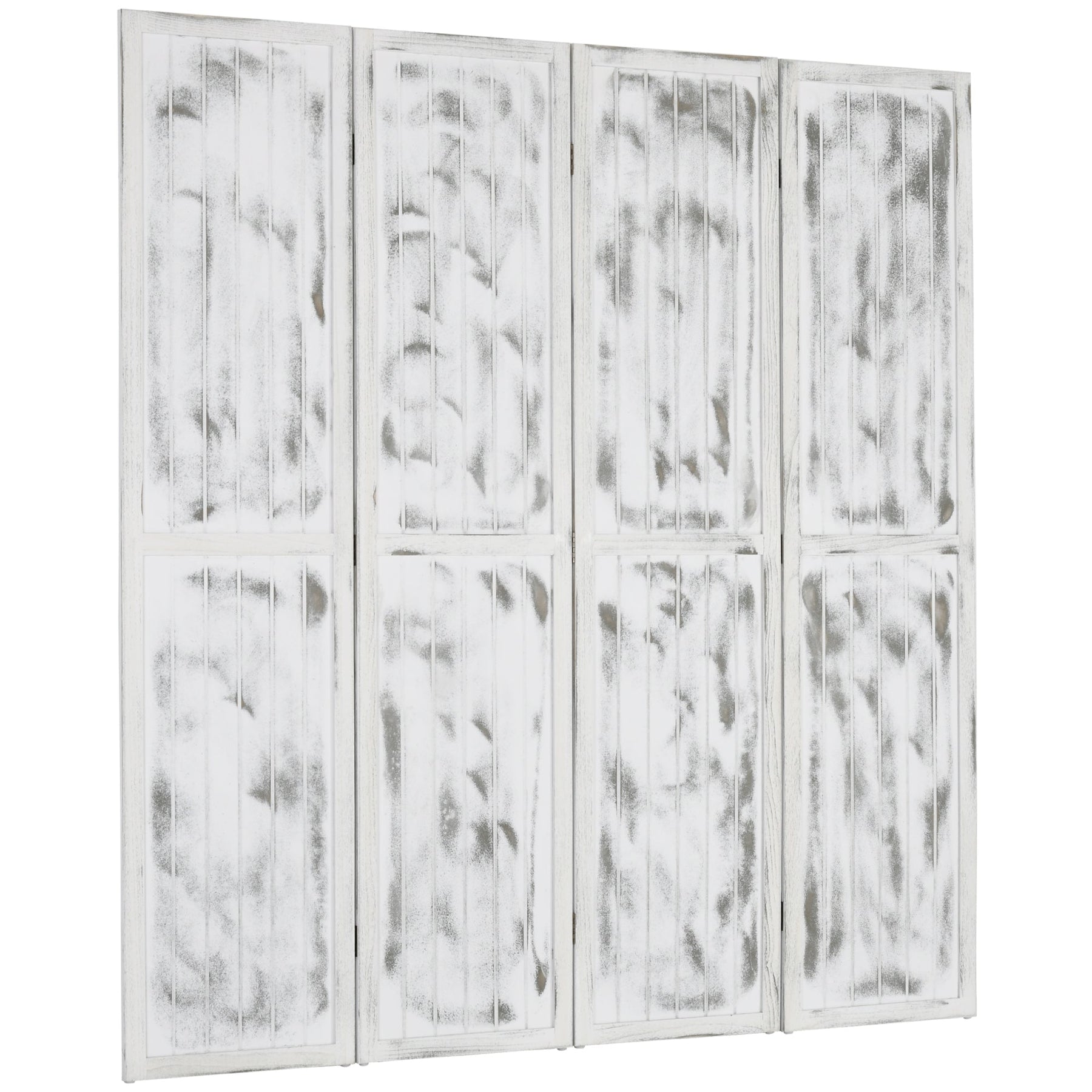 This stylish four-panel room divider is perfect for adding privacy wherever you need it. Ideal for dividing large rooms or creating a more intimate, enclosed space within a room, this divider enhances both functionality and aesthetics. The whitewashed wood-grain surface gives it a rustic charm that complements any living room, bedroom, or home office. Constructed with solid wood panels and nine connecting metal hinges, this room divider is sturdy, smooth, and easy to extend or fold. Its foldable design makes it convenient for easy storage and mobility, allowing you to move and store it effortlessly when not in use. A simple and effective privacy solution, this room divider comes ready to use right out of the box—no assembly required!