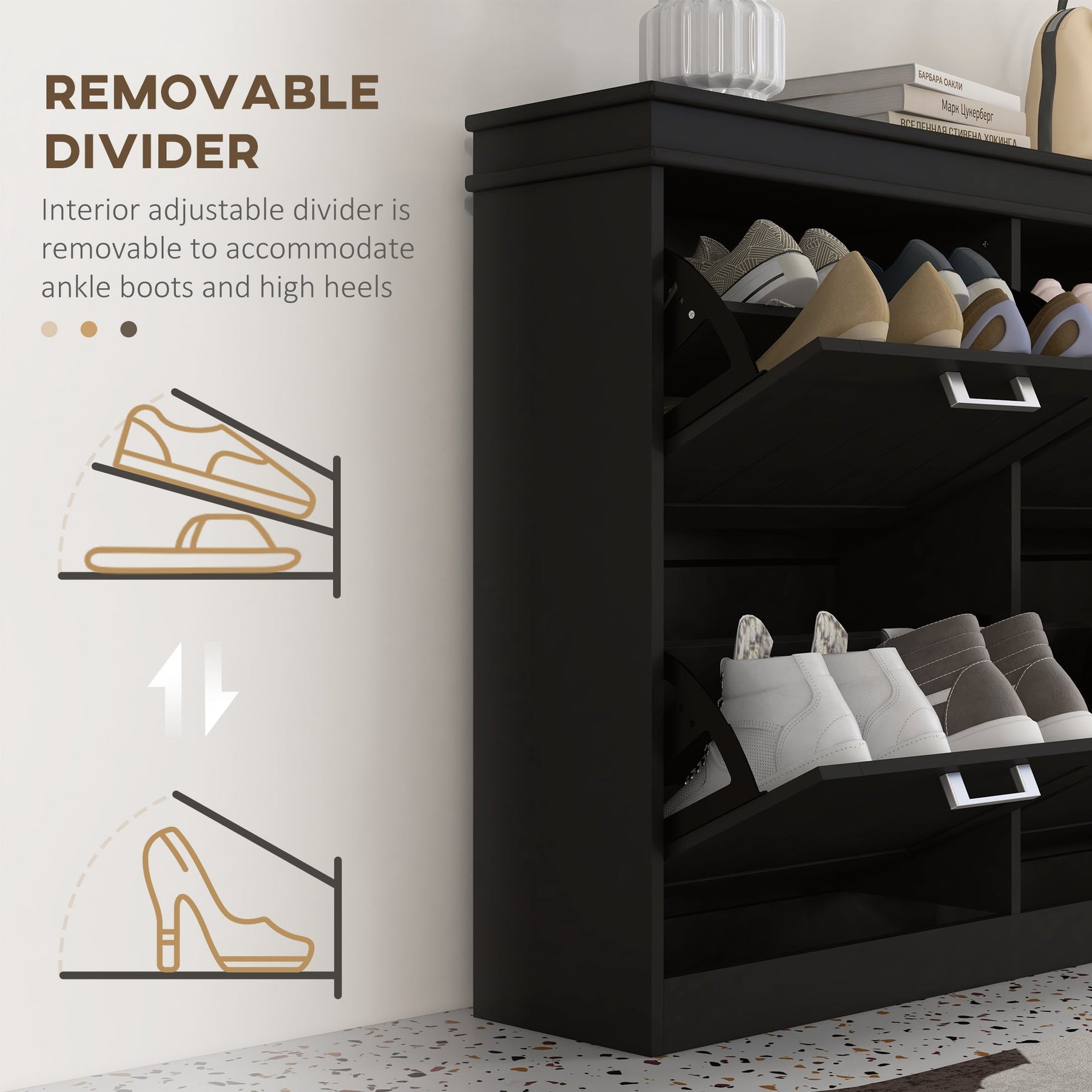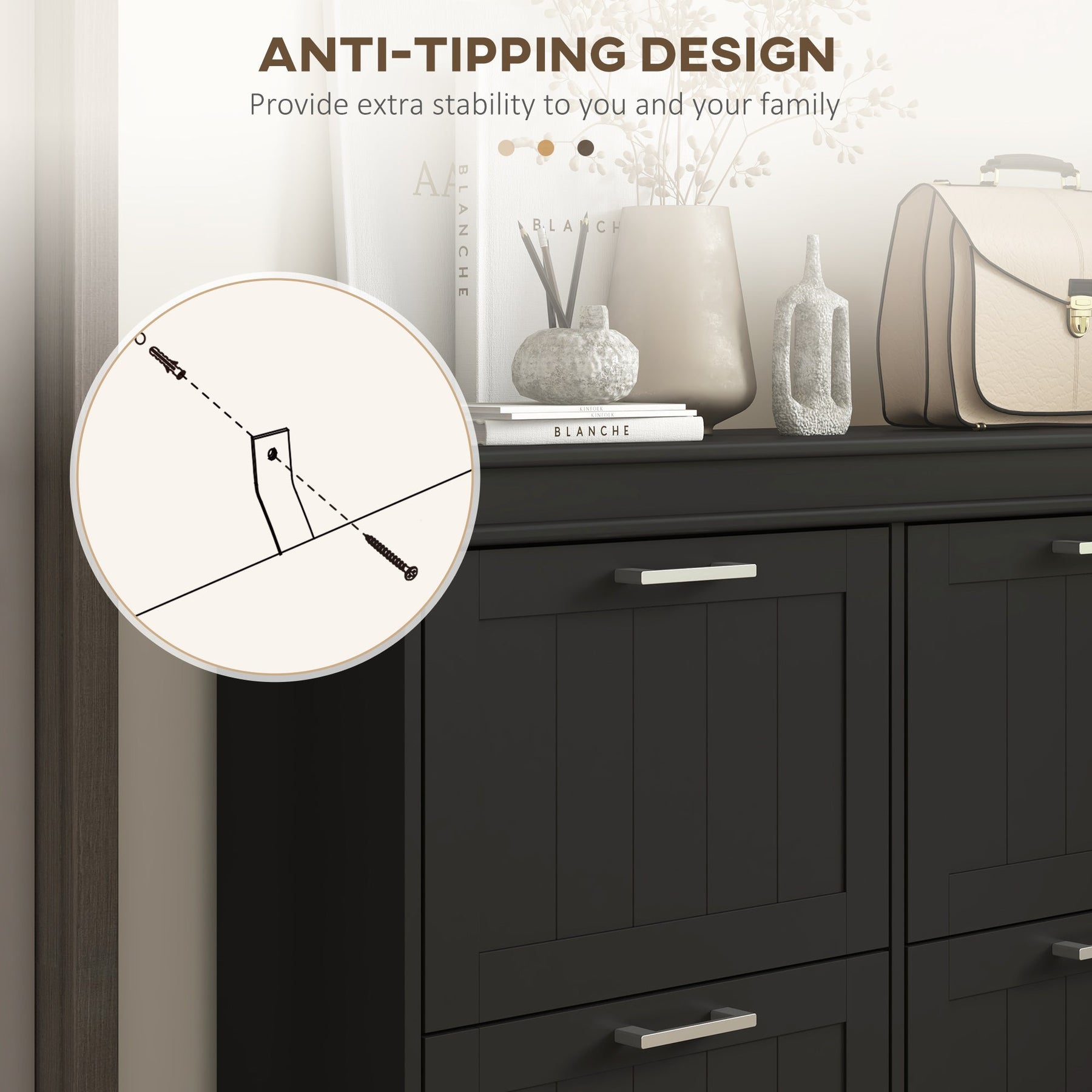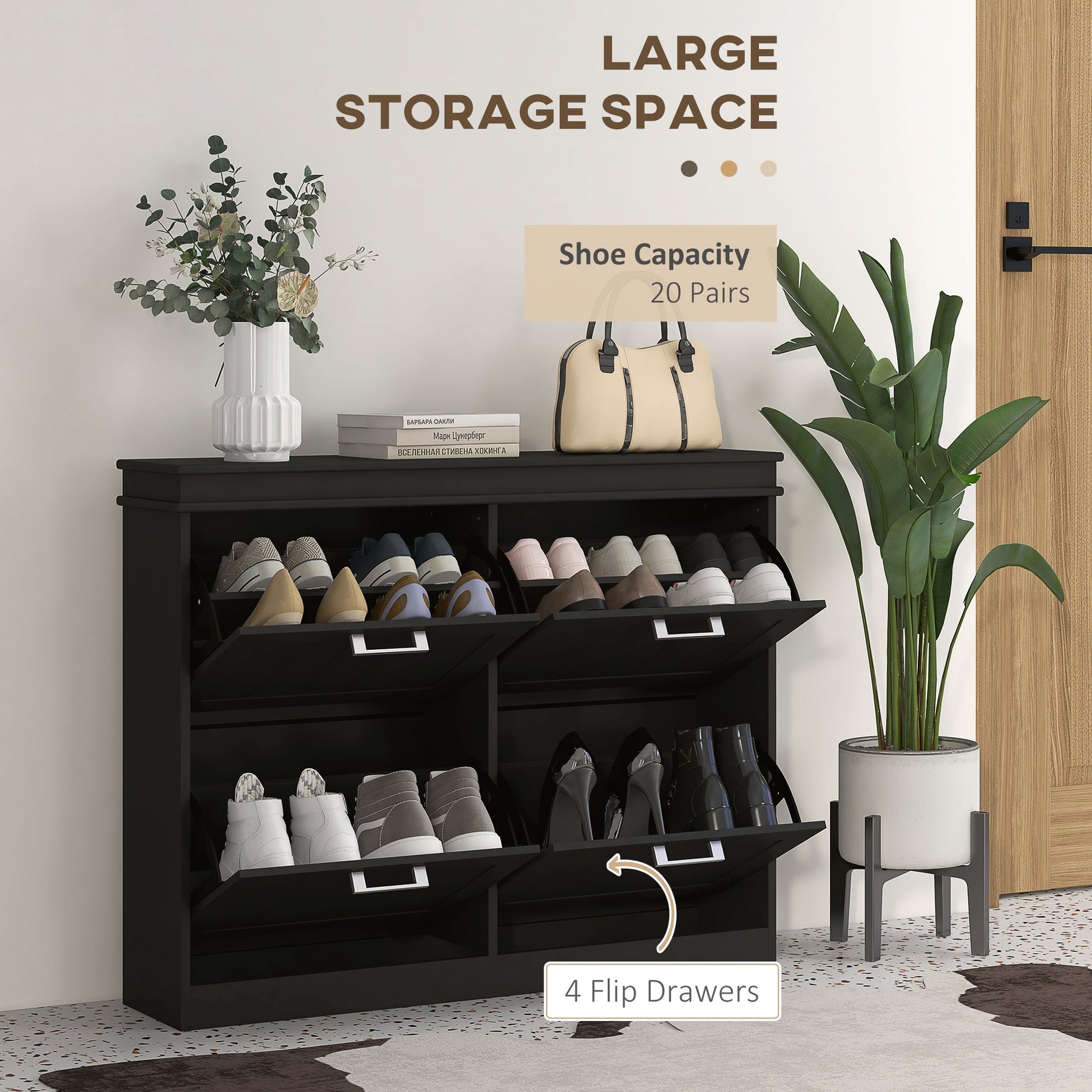 • Storage Solution: Flip drawers with 2-level adjustable shelves for customizable shoe storage and a flat tabletop for keys and wallets.