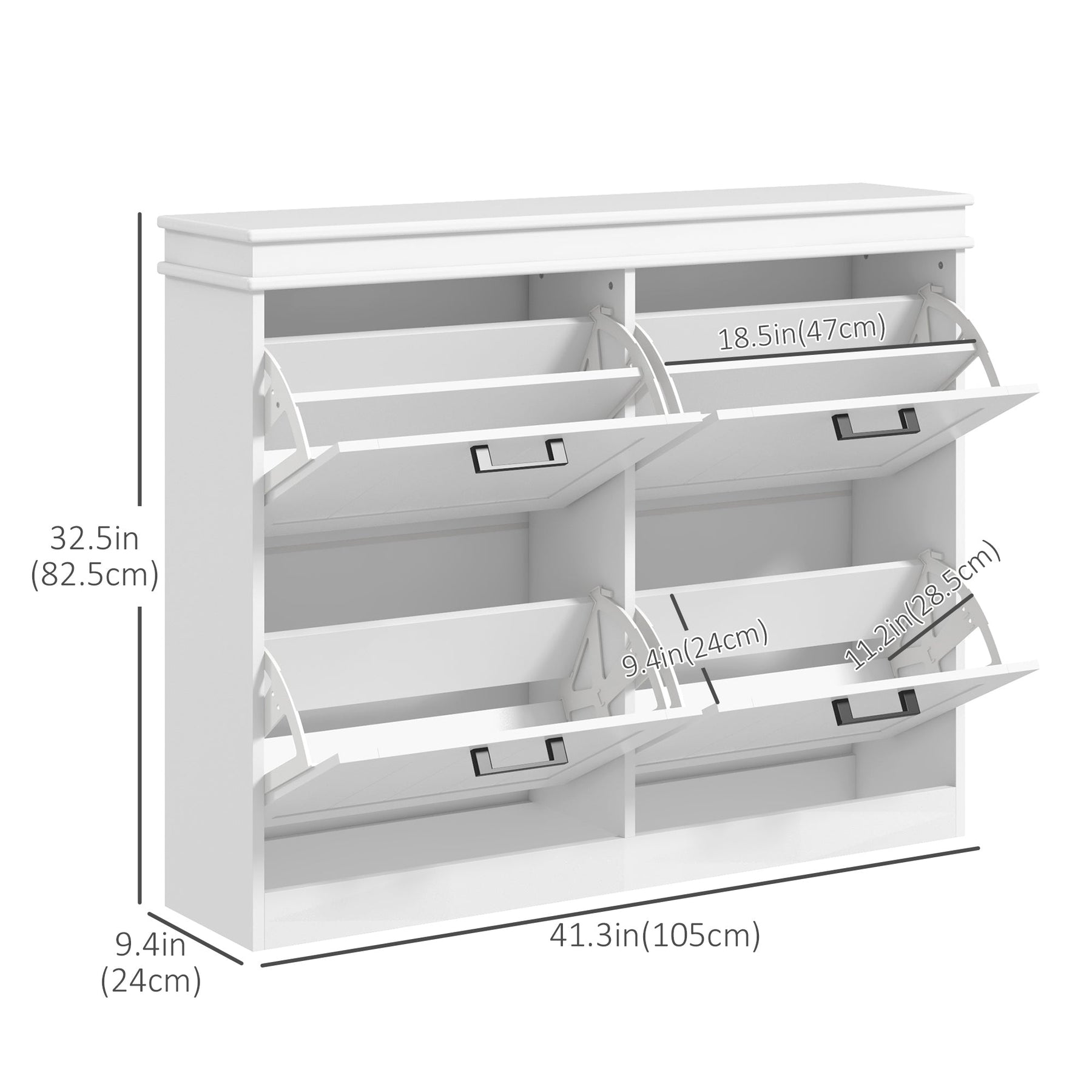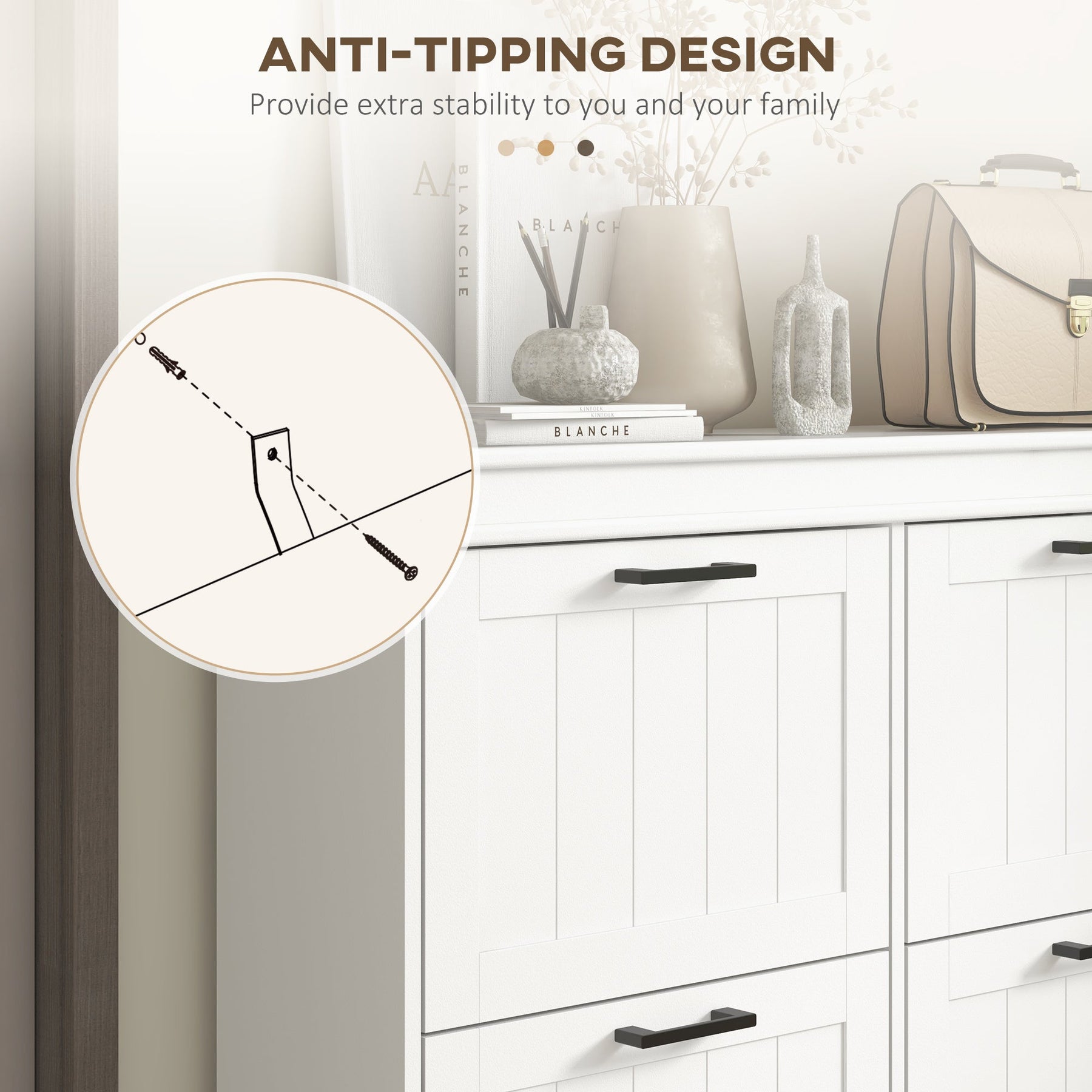 Maximize your entryway space with this practical and stylish shoe storage cabinet. Designed with flip doors and sleek strip handles, this compact shoe organizer ensures easy access while maintaining a clean and modern look. Ideal for narrow hallways or small spaces, it offers an efficient storage solution without taking up excess room. Each flip drawer features a 2-level adjustable shelf, allowing you to customize the interior space to fit different shoe sizes and styles. The flat tabletop provides additional space for placing keys, wallets, or decorative items for added convenience. Crafted from painted MDF board, this shoe cabinet is durable, easy to maintain, and built for long-term use. An anti-tipping design at the back enhances stability, making it a safe choice for families with children and pets. The minimalist design, featuring shaker panels and clean lines, blends seamlessly with various home décor styles, making it a perfect addition to your entryway or hallway.