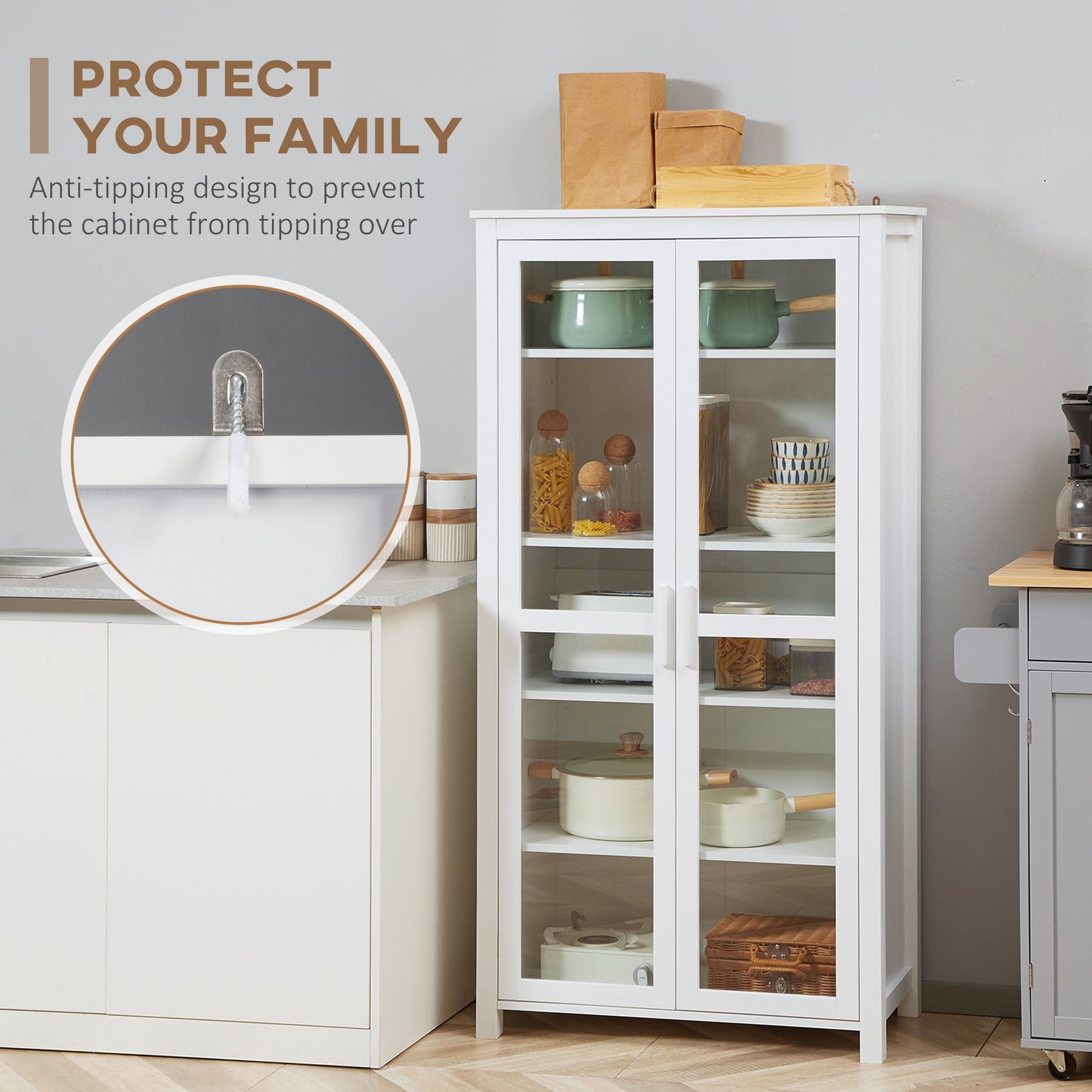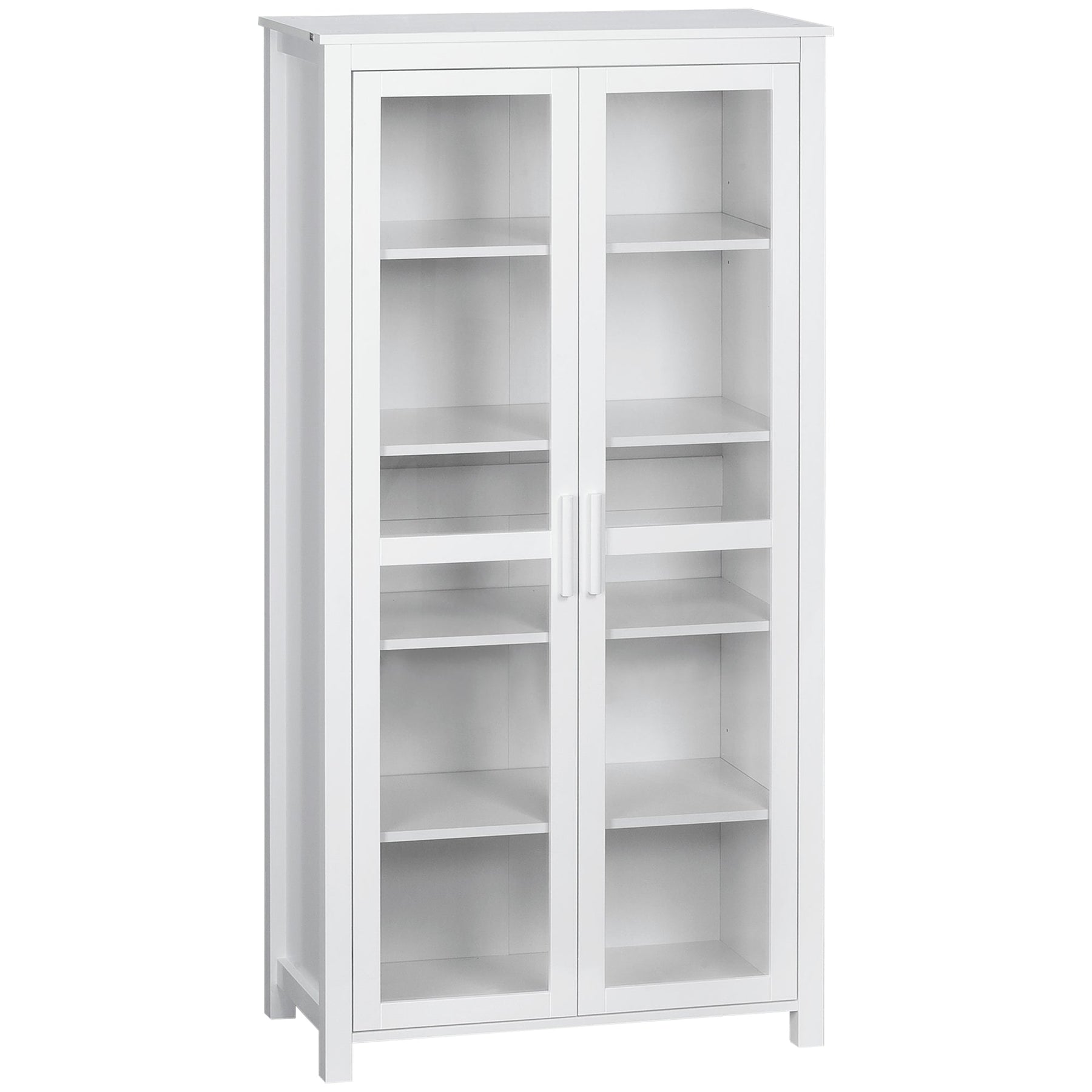 Looking for extra storage space in your kitchen? The HOMCOM kitchen pantry provides the perfect solution with its spacious 5-tier shelving. This storage organizer offers plenty of room for your dishes, pots, pans, cookbooks, dry goods, and plastic containers. With two glass doors, it keeps your items safe from dust while offering a sleek, modern look that enhances your kitchen, dining room, or living room décor. The top and bottom shelves are adjustable to fit taller items like pitchers, pasta containers, and blenders. Built with safety in mind, this pantry features an anti-tip design, ensuring stability by securing it to the wall. With a weight capacity of 132 lbs (60 kg) and each shelf holding up to 22 lbs (10 kg), this pantry cabinet is both functional and stylish. Assembly is required.