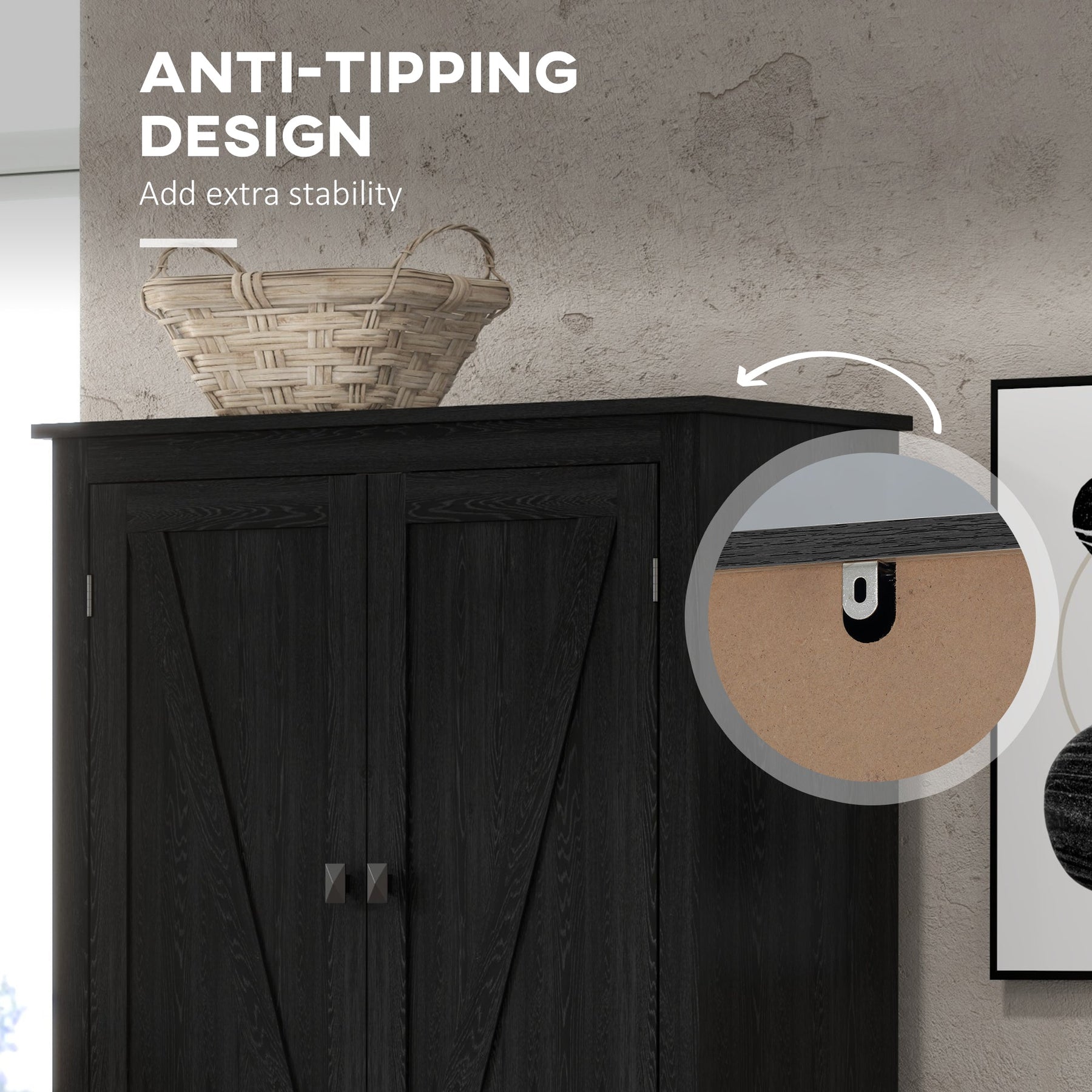 This farmhouse-style kitchen pantry cabinet adds both charm and functionality to your home. With its barn door design and black square handles, it brings a rustic appeal that complements any décor. The cabinet features four-tier shelving behind four doors, keeping your dishes, pots, pans, and small appliances organized and dust-free. The shelves are adjustable to accommodate taller items, making it easy to customize the storage space. Constructed with a durable MDF frame and equipped with an anti-tipping design, this pantry ensures stability and safety. It’s easy to clean and provides ample storage for your kitchen essentials.