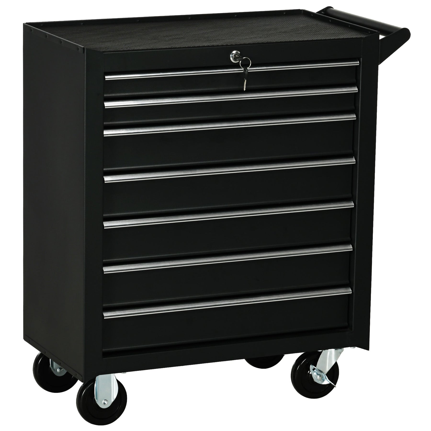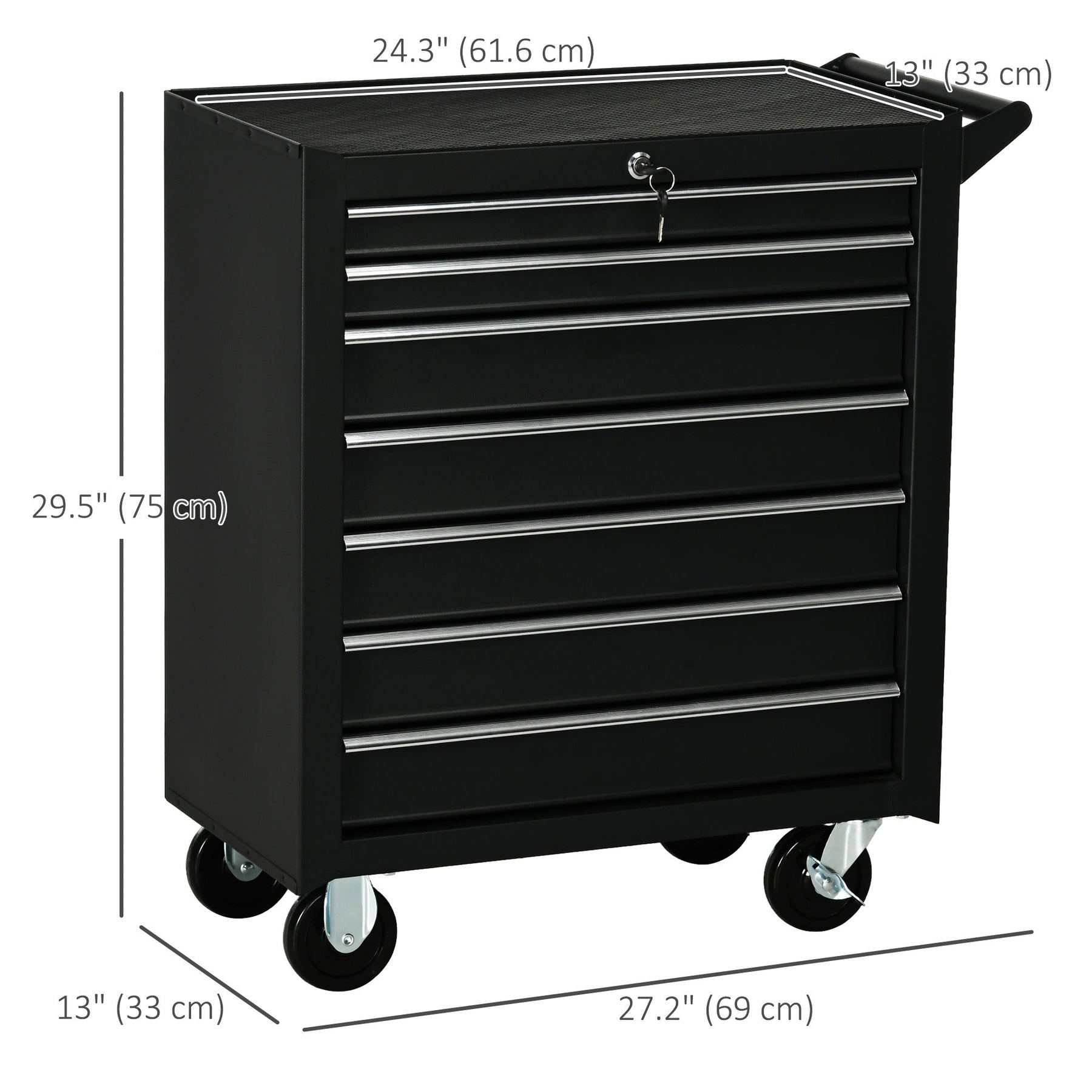 This seven-tier tool cart offers ample storage and organization for tools, equipment, and hardware, making it a perfect addition to your garage or workshop. Equipped with seven drawers featuring ball-bearing slides, it ensures smooth and easy access to your items. The sturdy steel frame guarantees durability and longevity, even in tough work environments. Each drawer is lined with EVA mats, which absorb oils and stains, helping to extend the life of the chest and keep your tools in top condition. The four wheels make it easy to move the cabinet around, and with a side handle, you can push or pull it as needed. Two of the wheels are lockable, allowing you to securely keep the cart in place when you're not on the move. For added security, the cart is lockable, ensuring that all drawers stay securely closed when not in use. The tool chest has a maximum load capacity of 330 lbs, with each drawer holding up to 33 lbs. This mobile tool chest is perfect for both professionals and DIY enthusiasts who need organized, reliable storage.