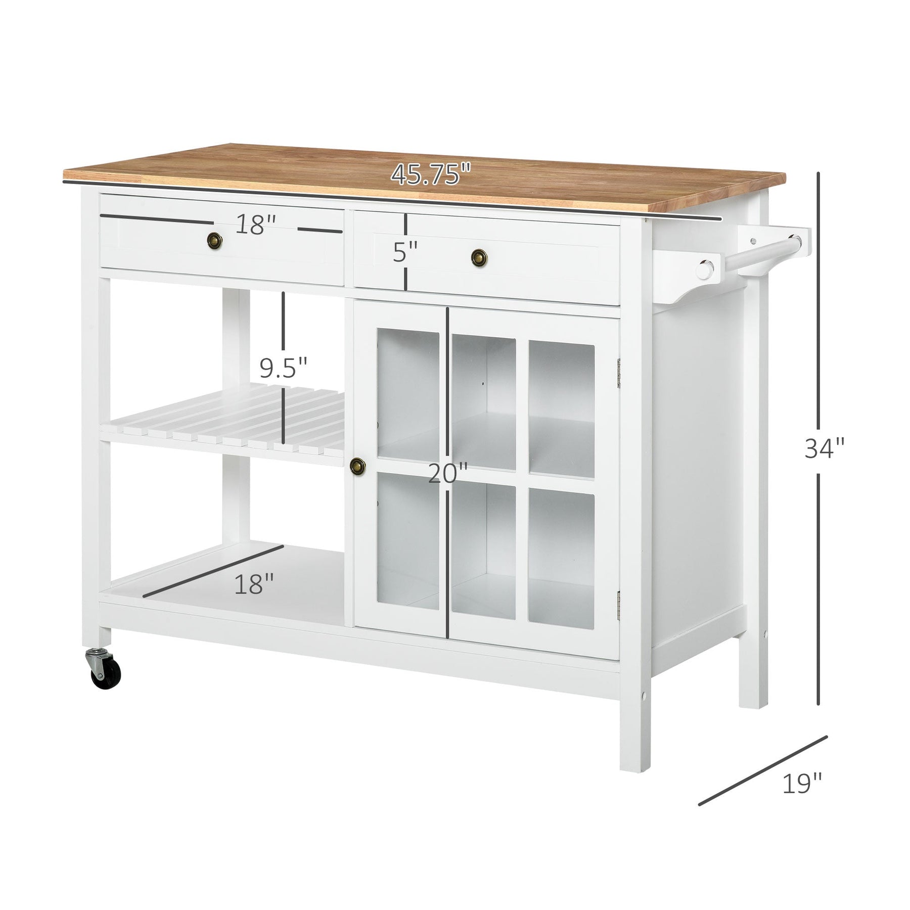 Maximize your kitchen space with this versatile and stylish kitchen island cart, designed to provide multiple storage options while enhancing functionality. Featuring two smooth-gliding drawers, a concealed cabinet, two open shelves, and a convenient towel bar, this kitchen cart offers ample space to store utensils, cookware, and everyday essentials. The framed glass door adds a touch of elegance, allowing for easy visibility while keeping items dust-free, and an adjustable shelf inside provides customizable storage options. Designed for mobility, this kitchen cart is equipped with two smooth-rolling casters, making it easy to move around or secure in place when needed. Constructed with a solid rubberwood tabletop and MDF panels, it ensures durability while providing an easy-to-clean surface. Whether used as a kitchen island, bar cart, or microwave stand, this multifunctional piece seamlessly blends practicality with modern design, making it an excellent addition to any home.