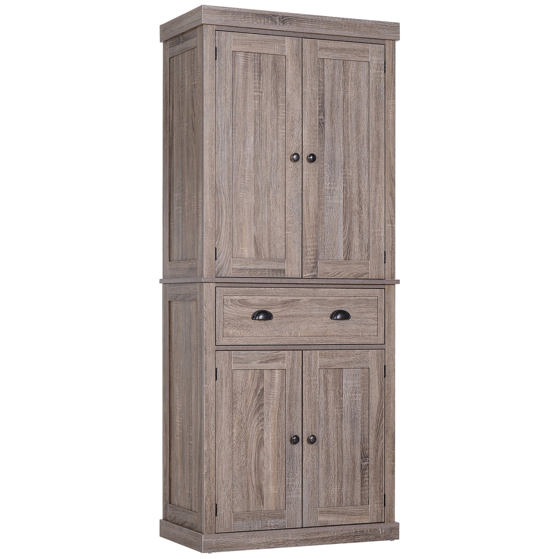 Make a statement with this elegant kitchen storage cabinet, featuring recessed panels and antique-style handles that bring a touch of classic charm to any space. Designed for both beauty and functionality, this versatile pantry cabinet provides ample storage while taking up minimal floor space. The center drawer and double-door cabinet open to reveal one fixed and three adjustable shelves, allowing you to customize storage for kitchen essentials, dining accessories, or household supplies. With its tall vertical design, this unit maximizes storage potential without overwhelming your space. Crafted from painted MDF and particleboard, it boasts a reinforced backboard and includes wall attachments for enhanced stability and durability. Whether used in the kitchen, living room, or bathroom, this storage cabinet offers endless organizational possibilities.