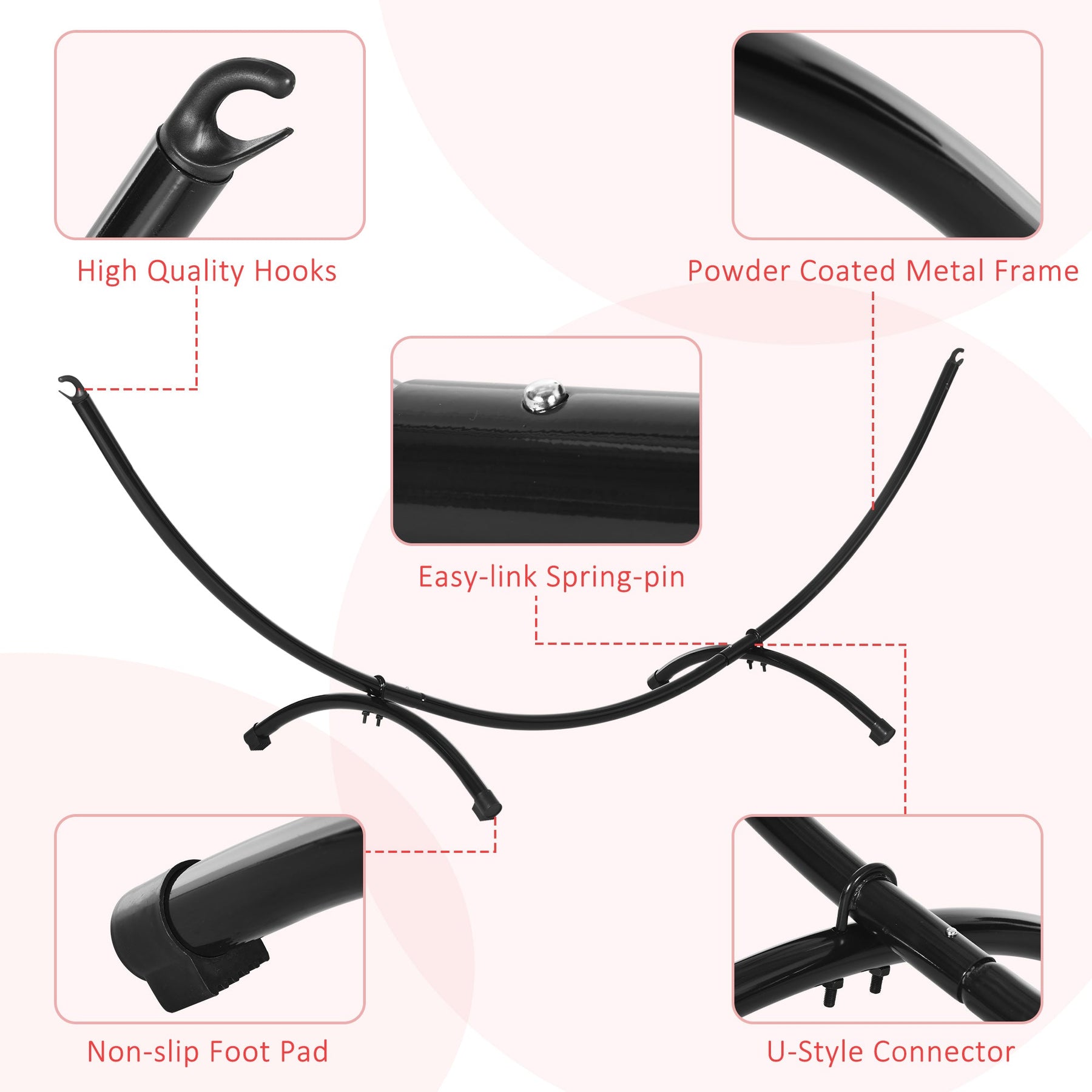 This 10' Hammock Stand is designed to support hammocks up to 120.1" (305 cm) in length, making it compatible with various hammock styles, including Brazilian, flat, and spreader designs. The steel frame is powder-coated to provide exceptional strength and durability, ensuring reliable support whether the hammock is empty or in use. The stand features 'U' shaped connectors that securely link the top and bottom, providing added safety. Non-slip foot pads make the stand extra stable and protect your floors from scratches and minor damage. With all hardware and clear instructions included, you’ll find assembly a breeze, allowing you to set up your hammock stand quickly and easily.